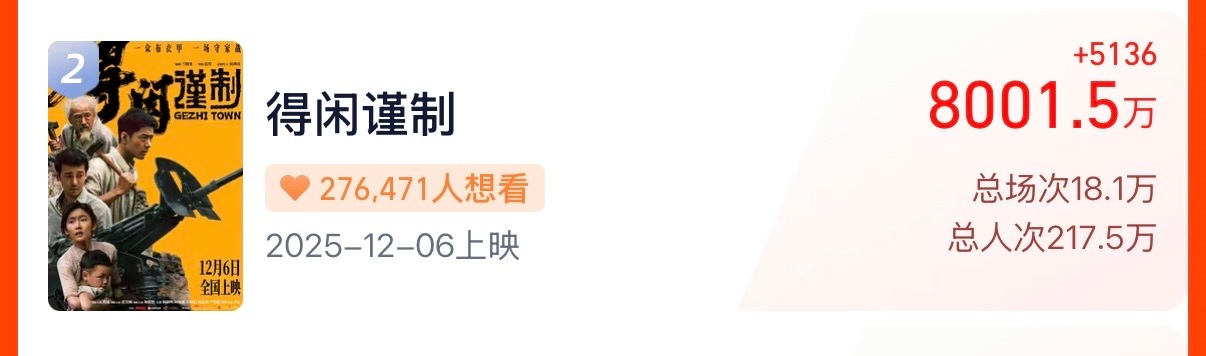 得闲谨制 太牛了太燃了!!!无任何宣发纯空降定档,同期开启极限预售,只用5天时间,《得闲谨制》实时预售票房破8000万👊🏻👊🏻👊🏻明后天破亿的时候我随1005👊🏻👊🏻👊🏻 电影得闲谨制