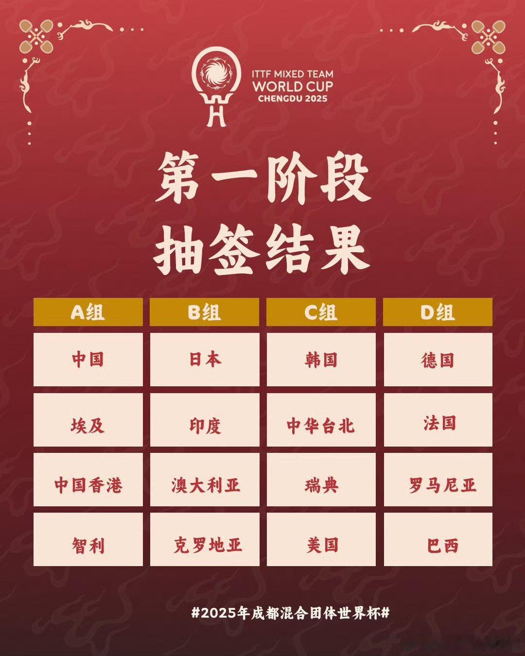 混团世界杯八强产生 第一阶段循环赛晋级队伍名单出炉A组:中国、中国香港B组:日本、克罗地亚C组:韩国、瑞典D组:德国、法国根据赛制,第二阶段同样采用循环赛的形式,并且在第一阶段交手过的队伍,交手成绩将带入第二阶段,与其他队伍进行循环赛。最终排名前四的队伍进入第三阶段比赛。 国乒8比0智利