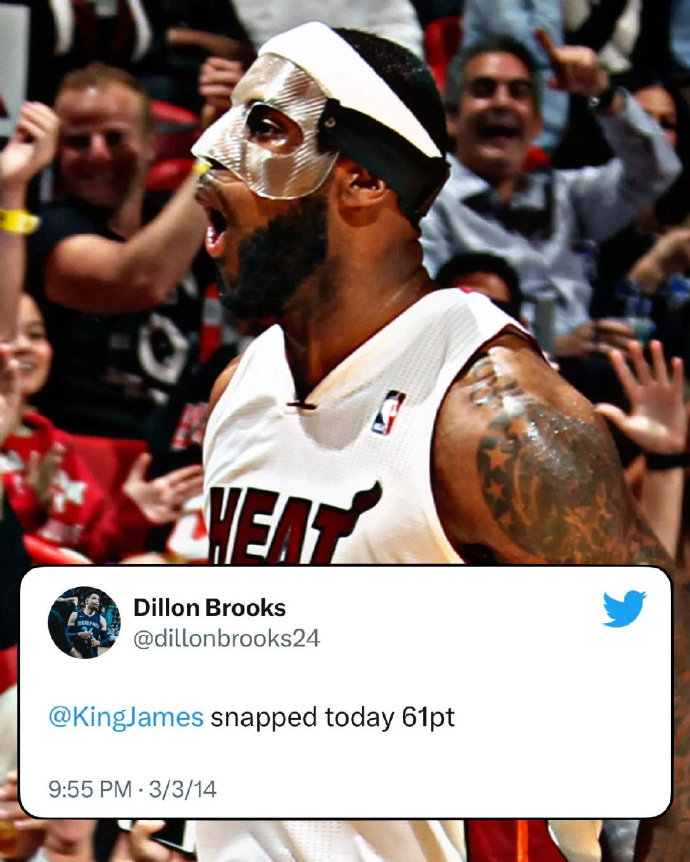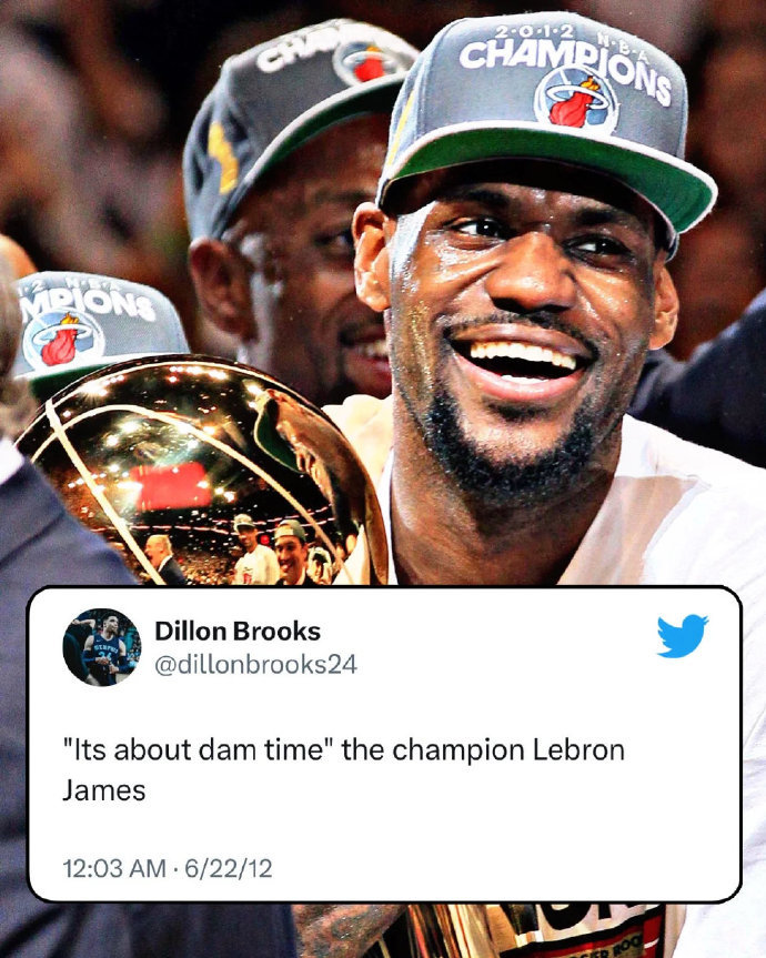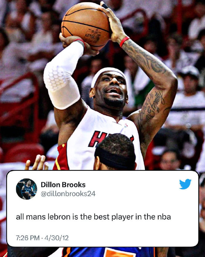 向你们介绍一位勒布朗最大粉丝:狄龙-布鲁克斯!!!12年4月30日,狄龙:“勒布朗是NBA最佳球员。”12年6月22日,狄龙:“‘是时候了’冠军勒布朗-詹姆斯。”14年3月3日,狄龙:“詹姆斯 今天狂砍61分。”18年6月10日,狄龙:“快来孟菲斯吧,詹姆斯” 狄龙说不想跟詹姆斯嘻嘻哈哈