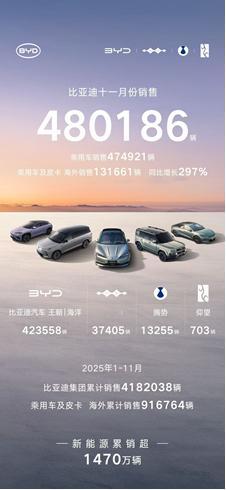 比亚迪11月销售480186辆,今年的新高;海外销售突破13万辆,历史新高。2025年1-11月累计销售4182038辆,新能源累计销售超1470万辆。具体到各个品牌:比亚迪王朝184338辆 | 海洋233431辆方程豹汽车销售37405辆腾势汽车销售13255辆仰望汽车销售703辆值得一提的是腾势的销量也逐步回暖,技术含金量逐渐释放出来了,明年会有很多新产品,可以期待一下。比亚迪