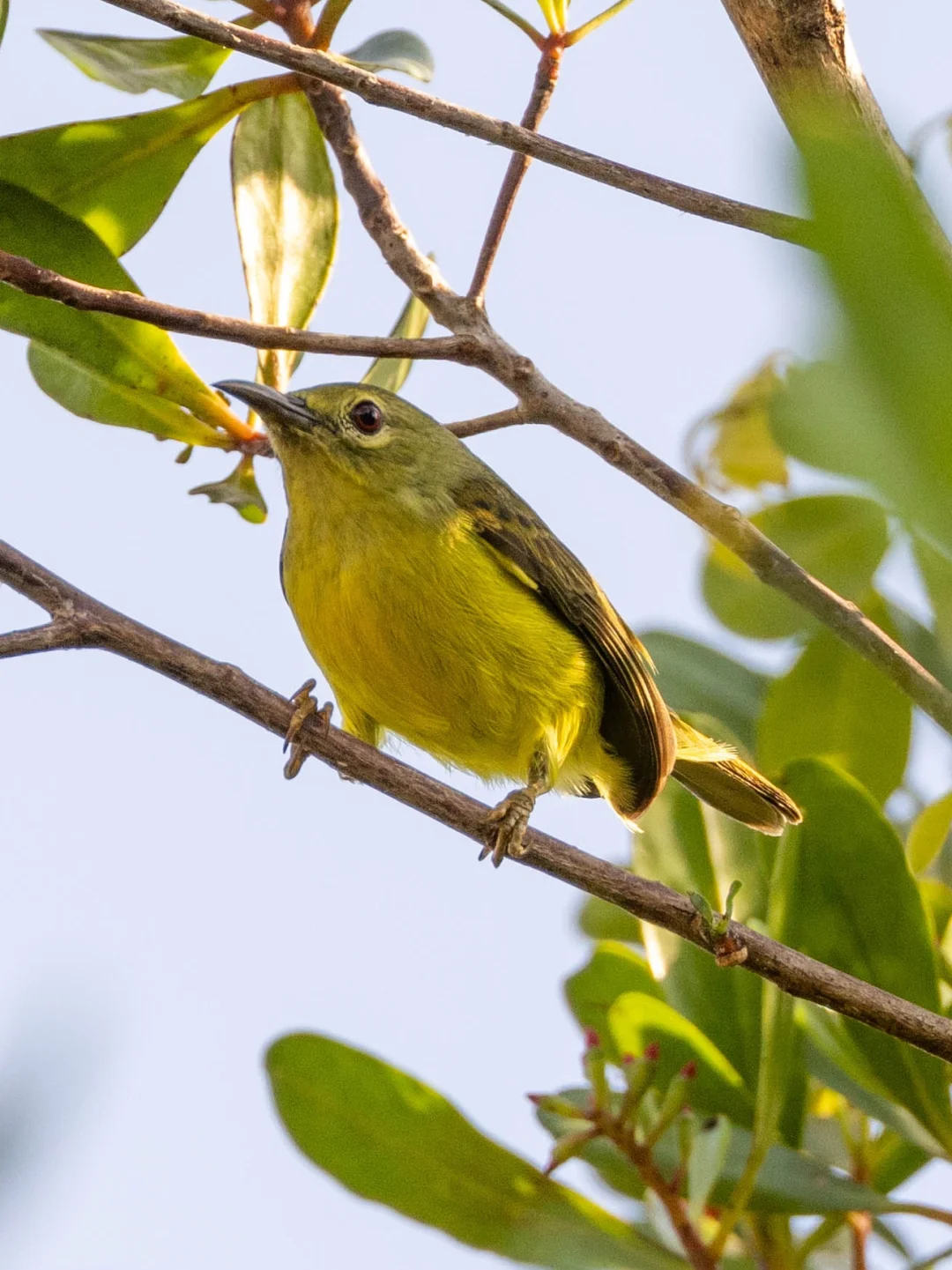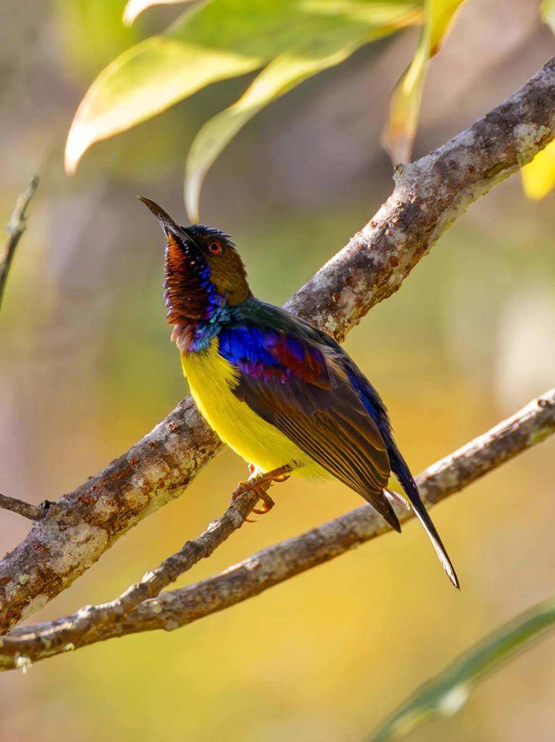 原创拍摄于2025.01 褐喉食蜜鸟,雀形目太阳鸟科食蜜鸟属。中国新纪录是2009年首次在云南西双版纳发现,在我国是罕见鸟。 褐喉食蜜鸟雄鸟非常漂亮,背部的蓝紫色有金属光泽,喉部是锈红色,这是名字来源,下体是亮黄色。雌鸟p4略黯淡,橄榄黄绿色。有一点和其他太阳鸟不同的是,它们的余部虹膜是红色的。 去年看到两只褐喉食蜜鸟夫妻在树上打架的场面,不过稍微有点远,这次近距离看到真是漂亮。那个阳光下面金属色的羽毛闪闪发光,惊呆了。