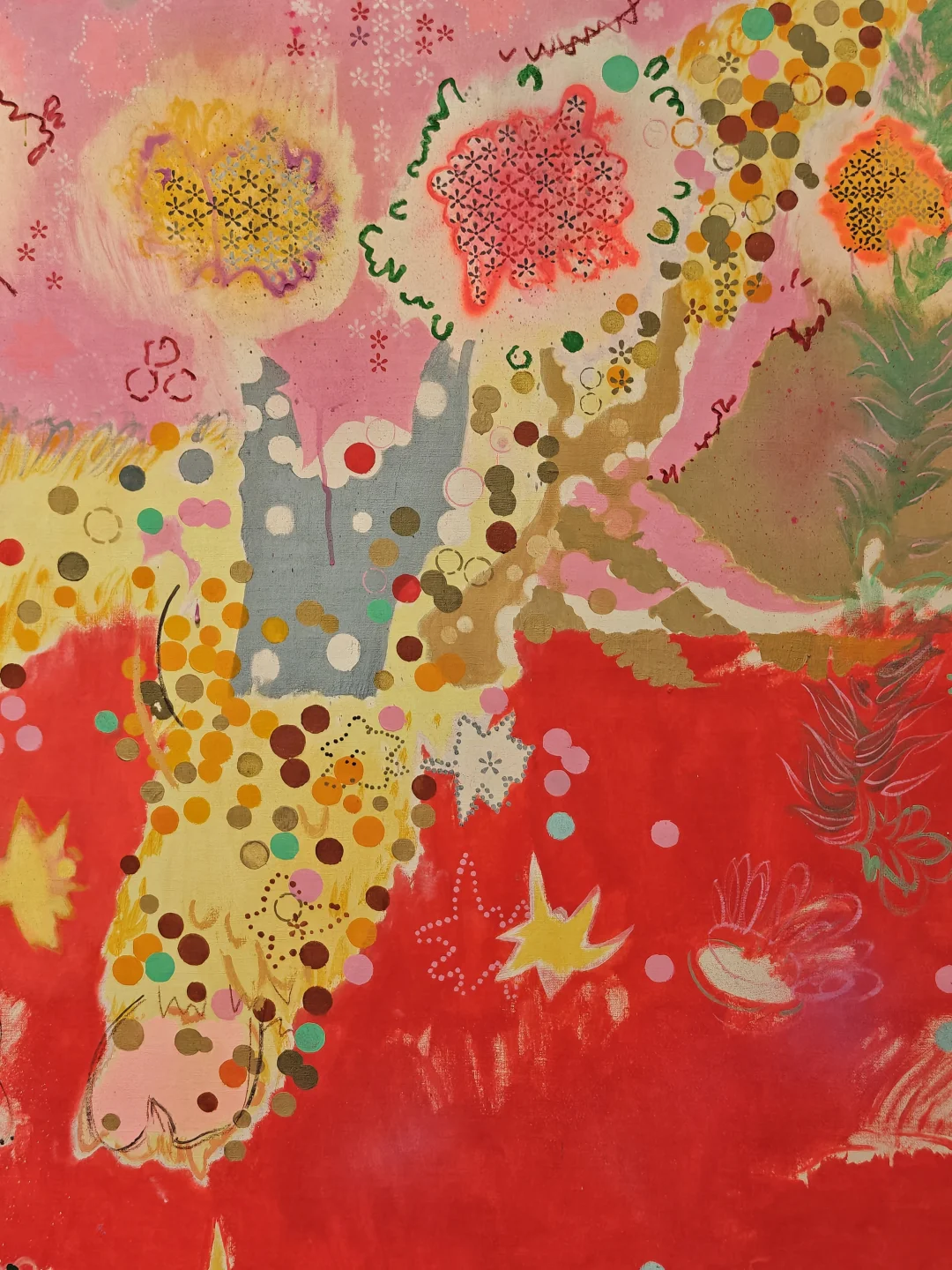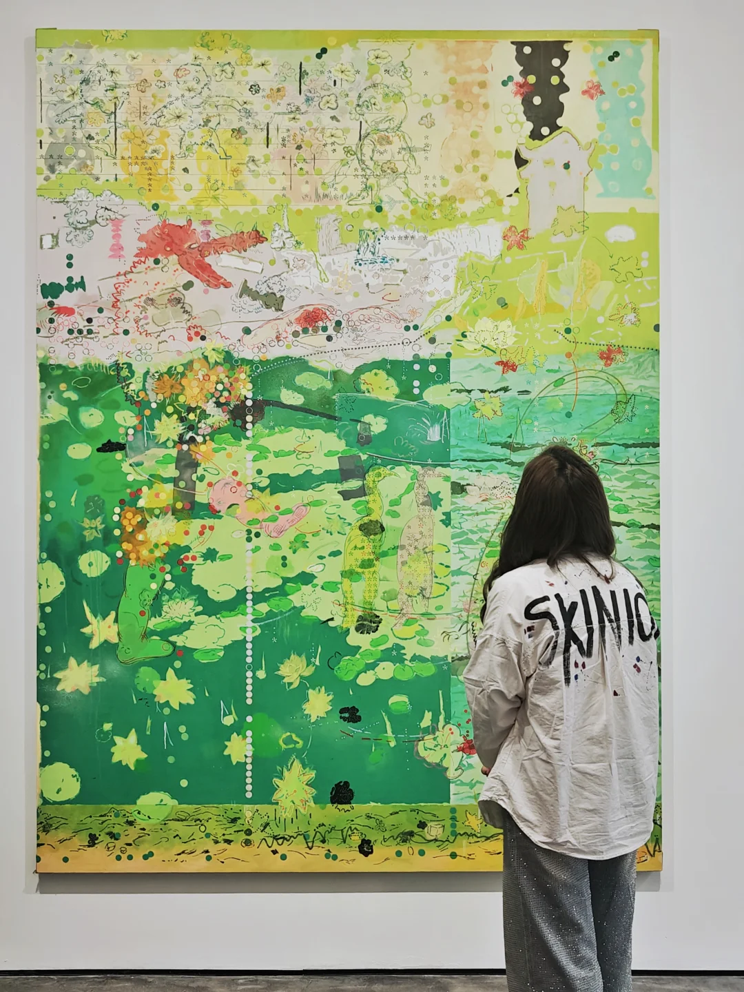 绘画以流动笔触构建未被标点钉死的句子,符号跳脱传统构图,形成自有的韵律。她拒绝秩序的暴力,而是通过“膜”的概念,让内在节奏自然展开。
