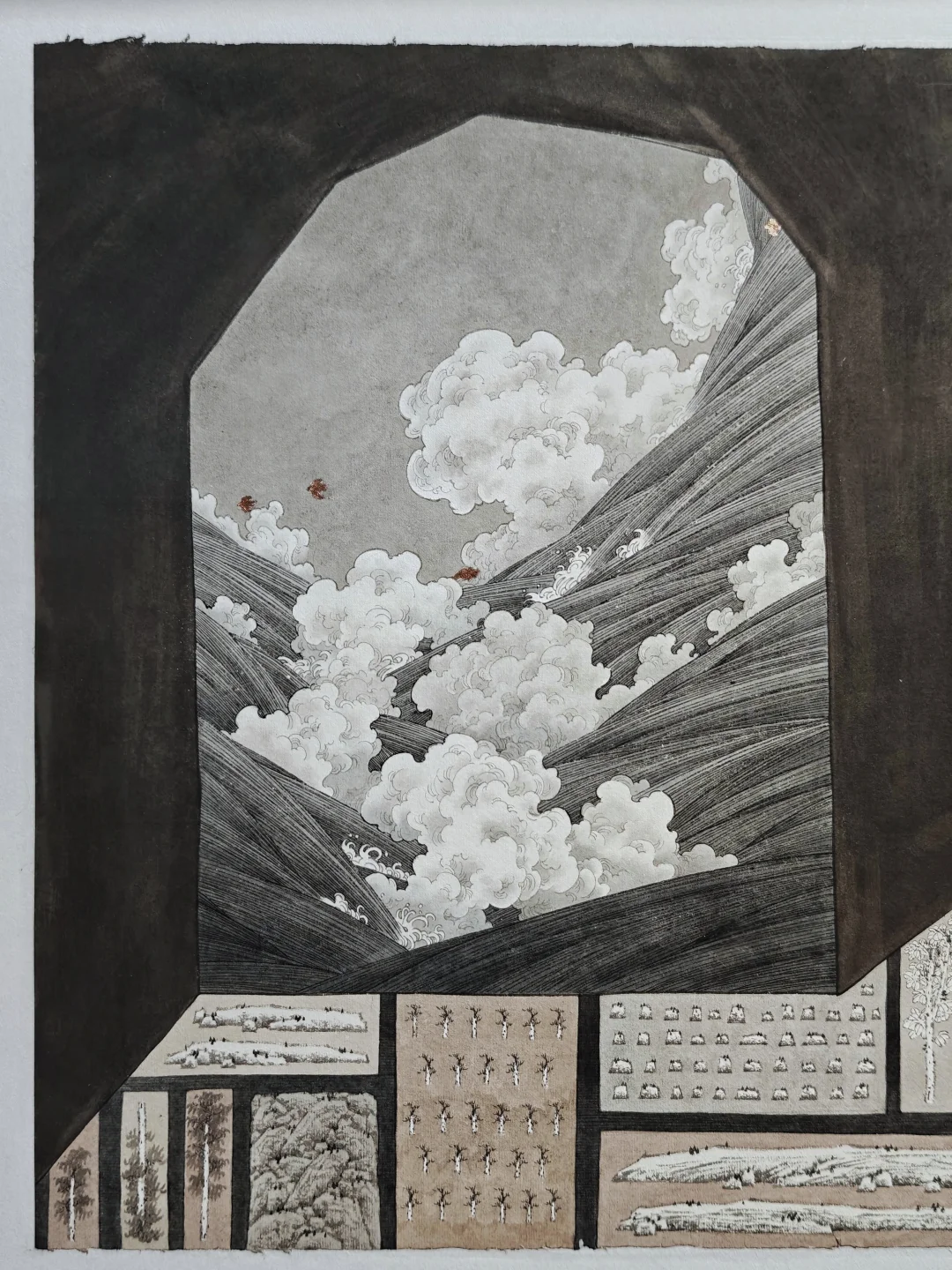 她以水墨创作探索传统山水画的当代转译,关注社会限制与流离。“洞穴”是封闭却语义充盈的系统——景观更迭象征意识游移,如同自我编写的语法体,暂时抵御外部结构的侵入。