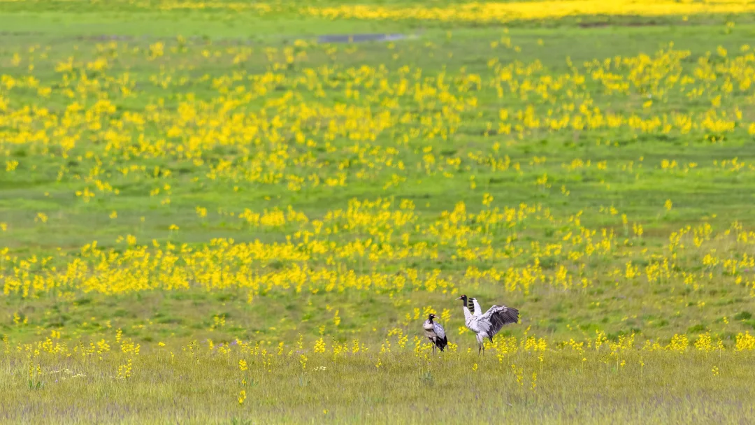 原创拍摄 黑颈鹤,鹤形目鹤科鹤属。是鹤科鹤属中唯一的高原鹤类。头部和上颈部有2/3是黑色的。国家一级保护动物。 这是在青海果洛自驾旅行的途中偶然看到的一幕,赶紧踩刹车拍了一张,实在是太美了,两只黑颈鹤在茫茫的鲜黄色花海里翩跹起舞。 之前拍的图鉴式鸟片比较多,这两只鹤比较远。但是由于太美了,还是翻出照片发出来欣赏一下。