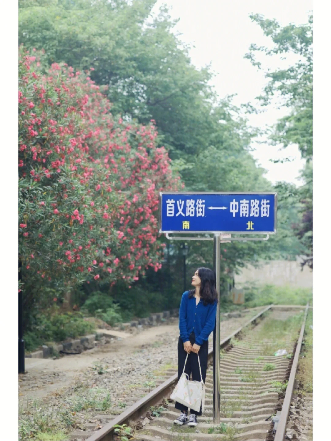 废弃铁轨旁大片夹竹桃盛开,开满花的铁轨好浪漫