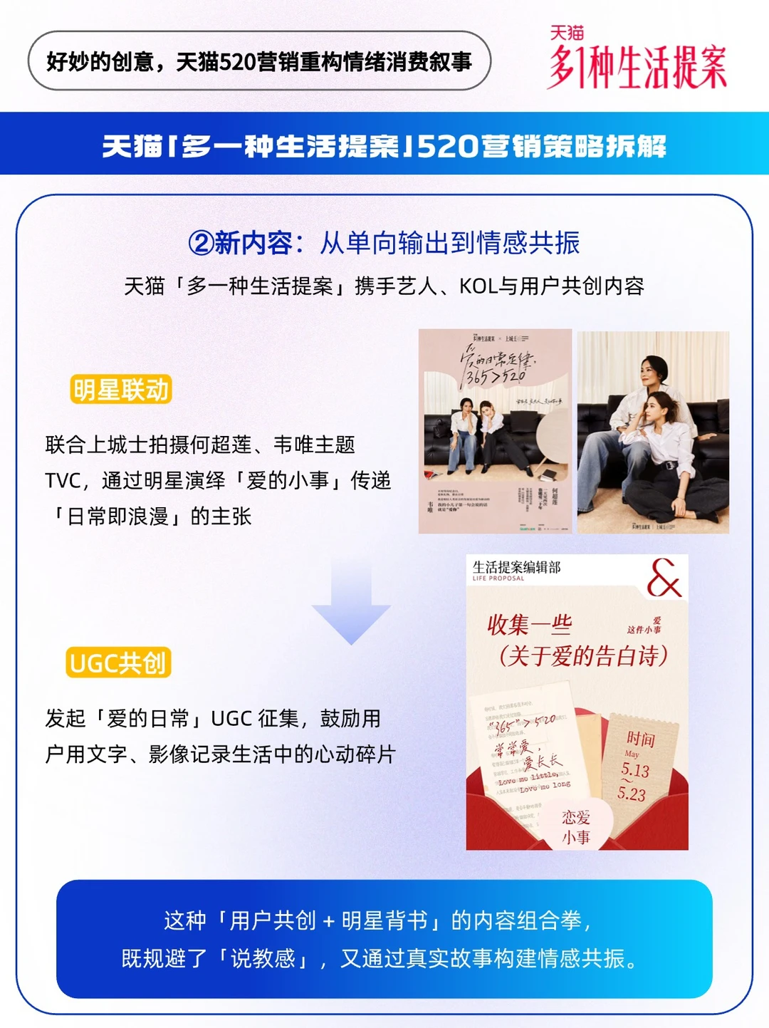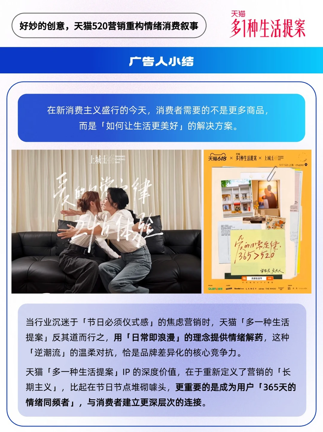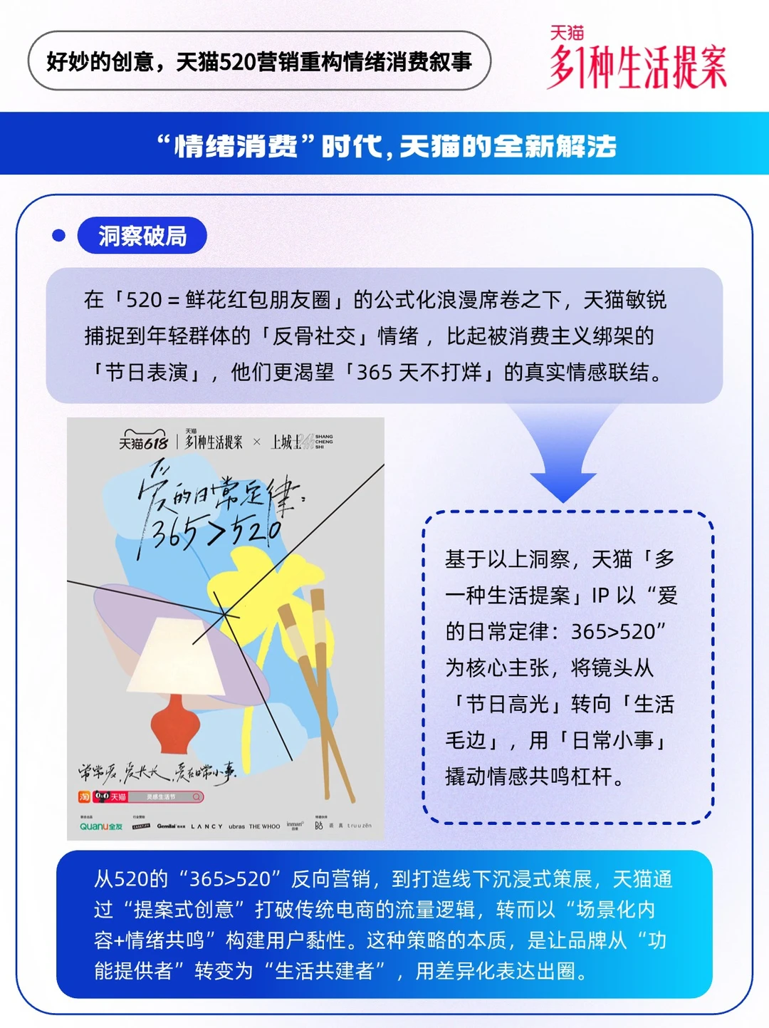 天猫「多一种生活提案」IP 以 “爱的日常定律:365>520” 破局,拒绝将情感表达捆绑于特定节日,转而深耕365天的真实日常。