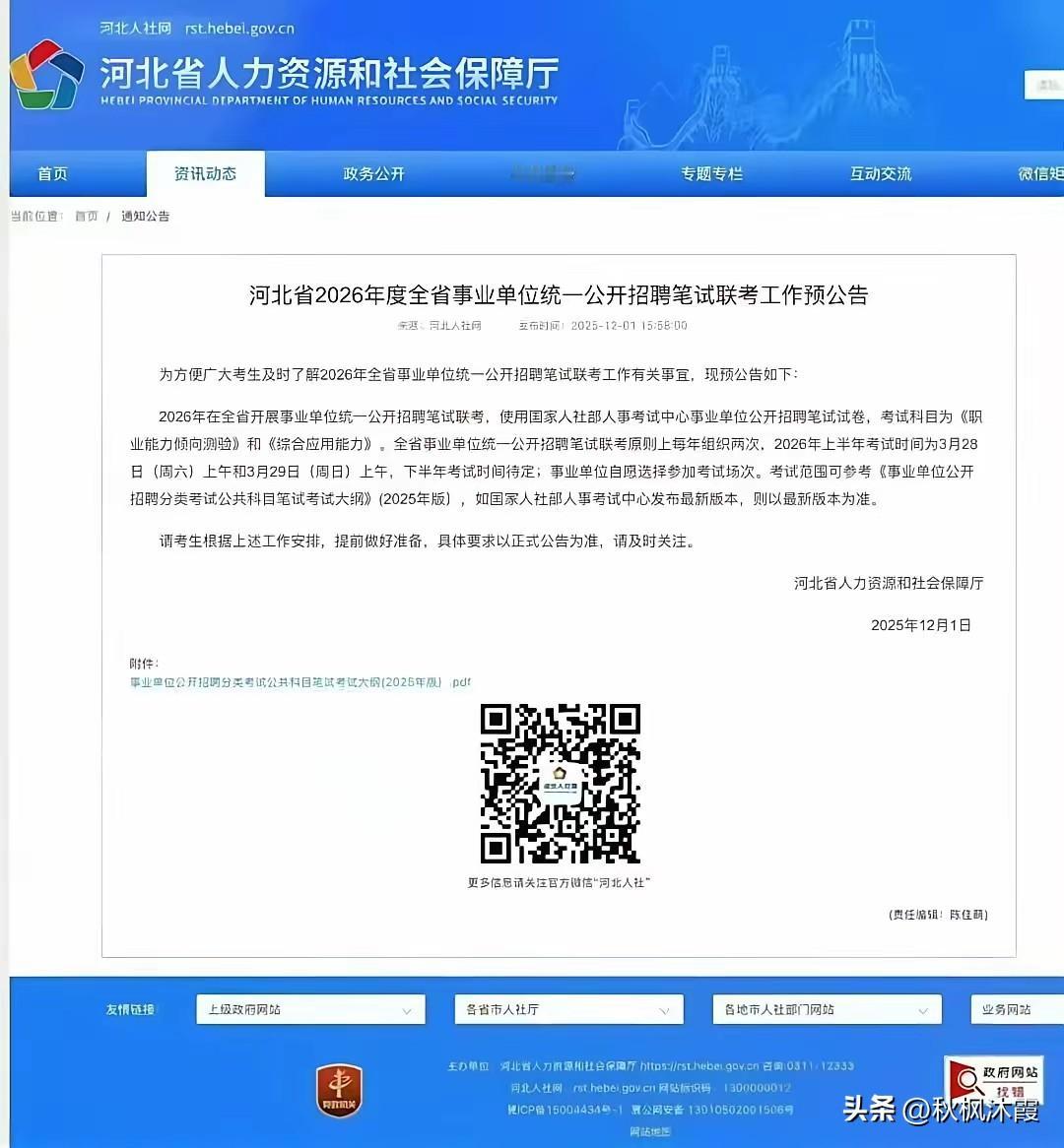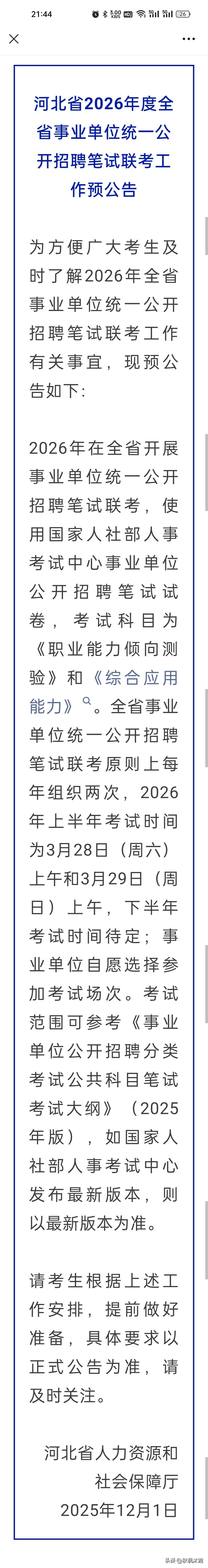 又是一个新的考试动向。 前些天,我就留意到培训机构透露的河北事业编考试的这个消息,考虑到怕影响孩子考试,国考之前没跟孩子提及,昨天和今天这个消息得到了官方的确认,这就是板上钉钉的了。 原来的事业编考试模式,对孩子们来说,参加考试机会多多,现在一年只两次,全省统一联考。 孩子们就业忒难,忒卷啊。 招考事业单位 事业单位考公 事业单位考试 事业编考公 河北事业编