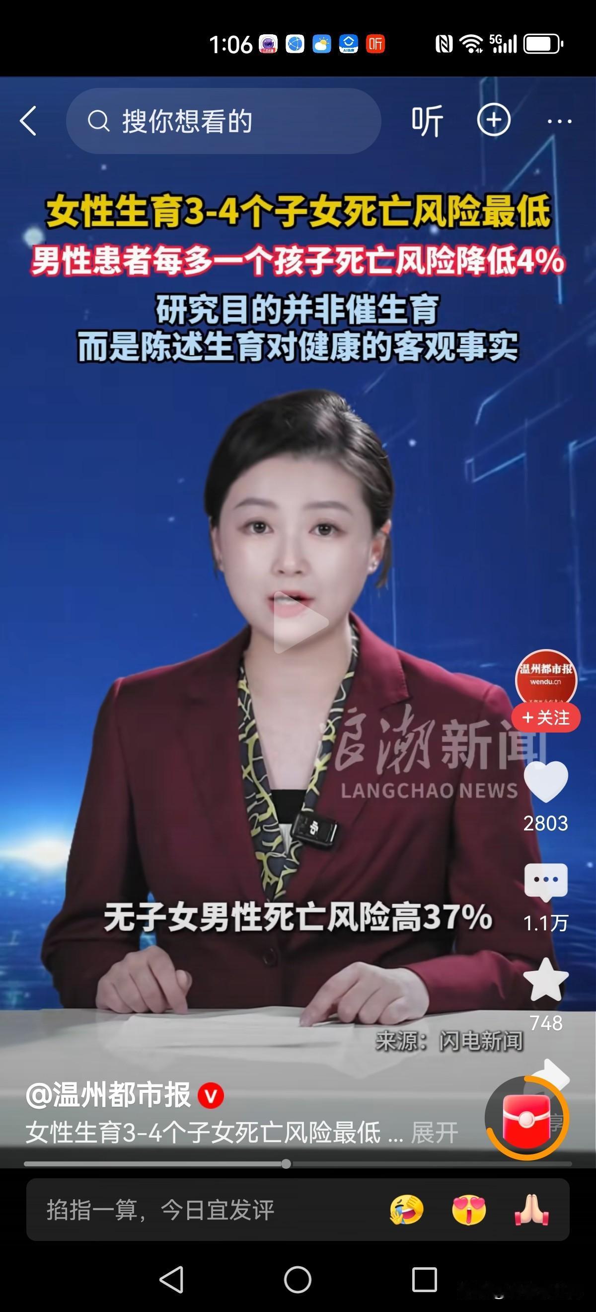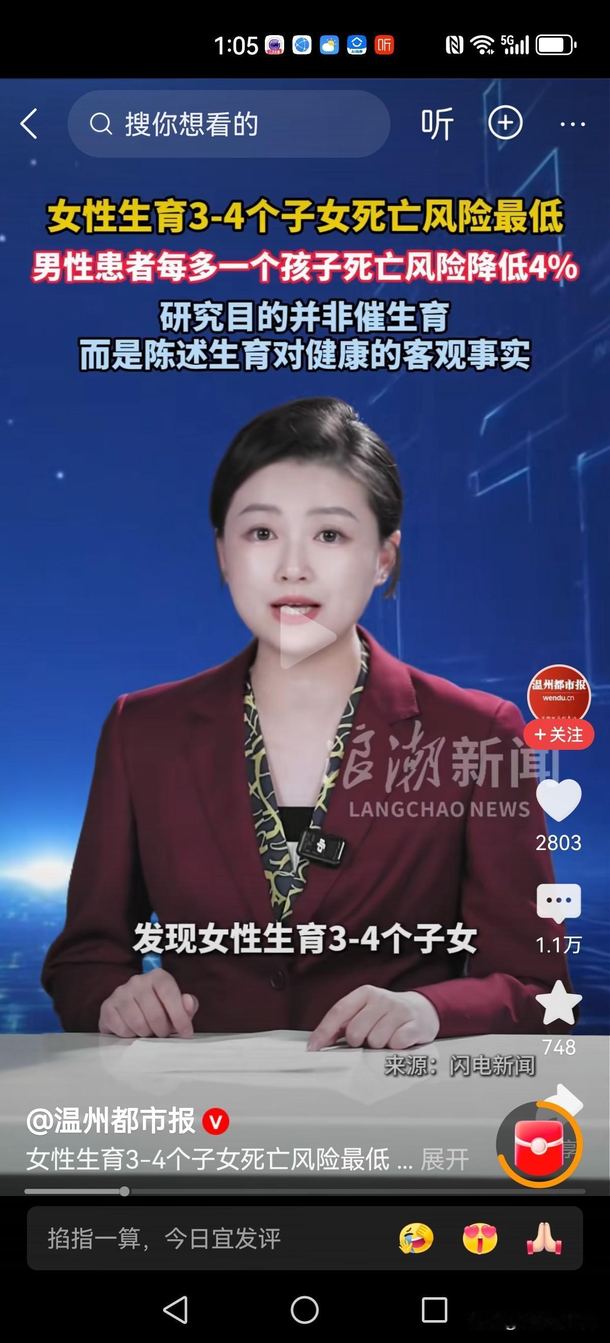 女性生育3-4个孩子死亡风险最低,男性每多生一个孩子死亡风险降低4%。 这都是谁研究出来的结论,有什么客观依据吗?研究目的不是为了催生,那是为了什么呢? 真是脑洞大开。您直接说女性生育10个孩子寿命可以延长10年,生20个寿命可以延长20年………… 反正怎么漂亮怎么说,这个不犯法!生育现状 几岁生孩子 生育误区 女性低生育率 生育差别 女性生育年龄 高龄生育