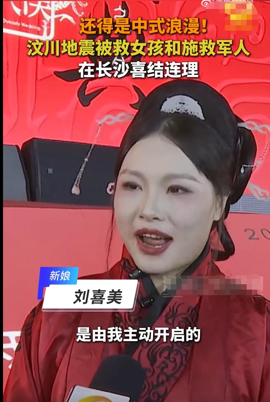 祝福,17年后27岁的汶川地震女孩和救他的军人结婚 2020的一天地震女孩刘喜美和曾经救她的军人梁智斌在长沙街头偶遇,之后就相恋了,在和女方家人吃饭的时候刘喜美的妈妈认出了梁斌就是当年汶川地震救她女儿的人。 大家都很喜悦,过去这么多年还能再相见,毕竟年龄悬殊了十二岁,梁斌一直把刘喜美当作妹妹照顾,但是后面刘喜美主动追的梁斌,两人在很多方面很聊得来,“她就像一束热情的光”,一点点照进了梁斌的心。” 虽然有十二岁的代沟,但是这个代沟经常会闹笑话,成为他们生活的调味剂,这段感情注定要慢慢磨合,但却不能阻止他们在一起的决心。 刘喜美说“如果只是为报恩,不会选择嫁给他。”我相信这是真的嫁给了爱情吧,有时候爱情来得突然不是没有理由。 这段感情让我想起了张宇的一首歌,歌词是“一定是特别的缘分,才能一路走来变成了一家人”