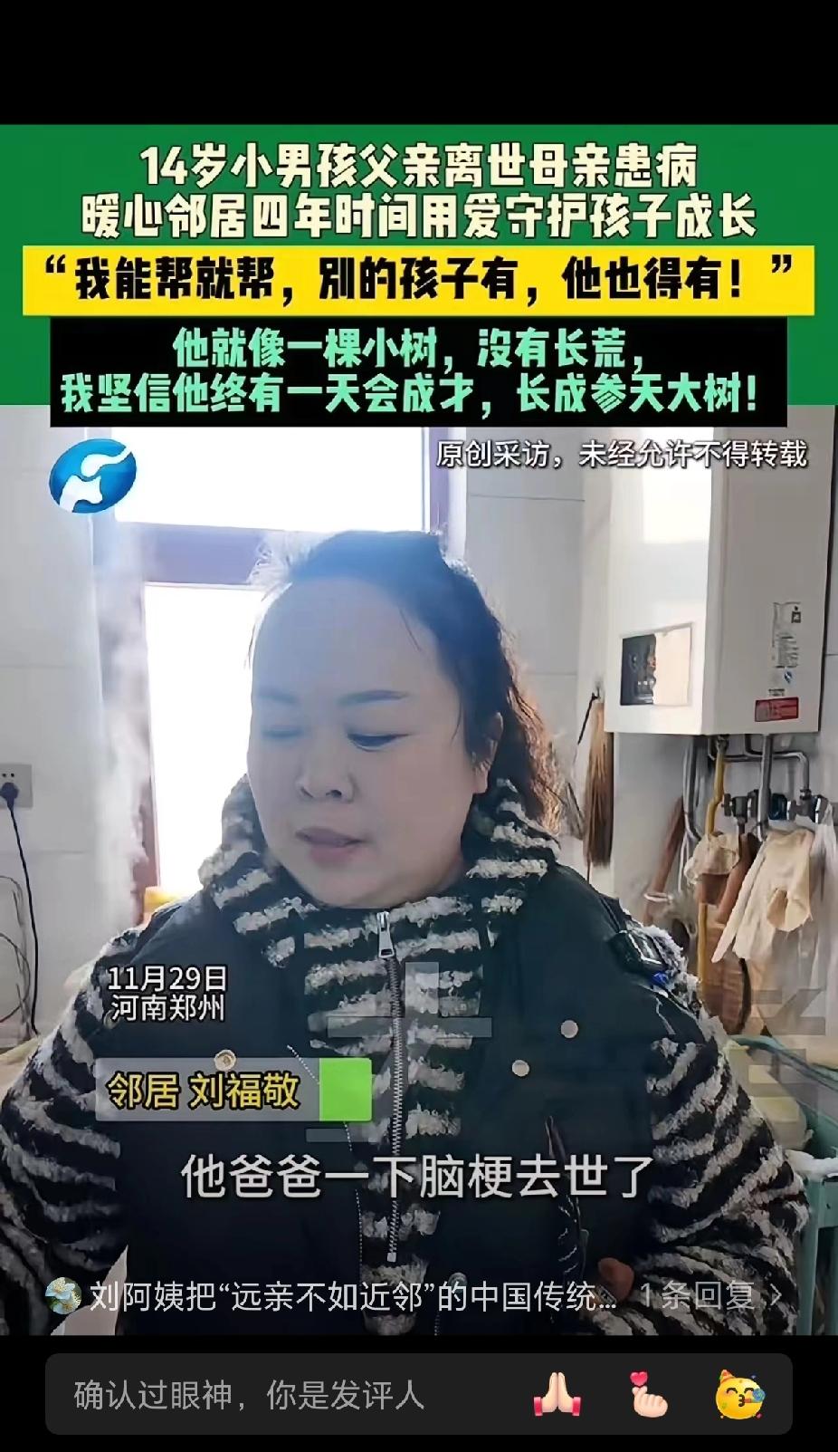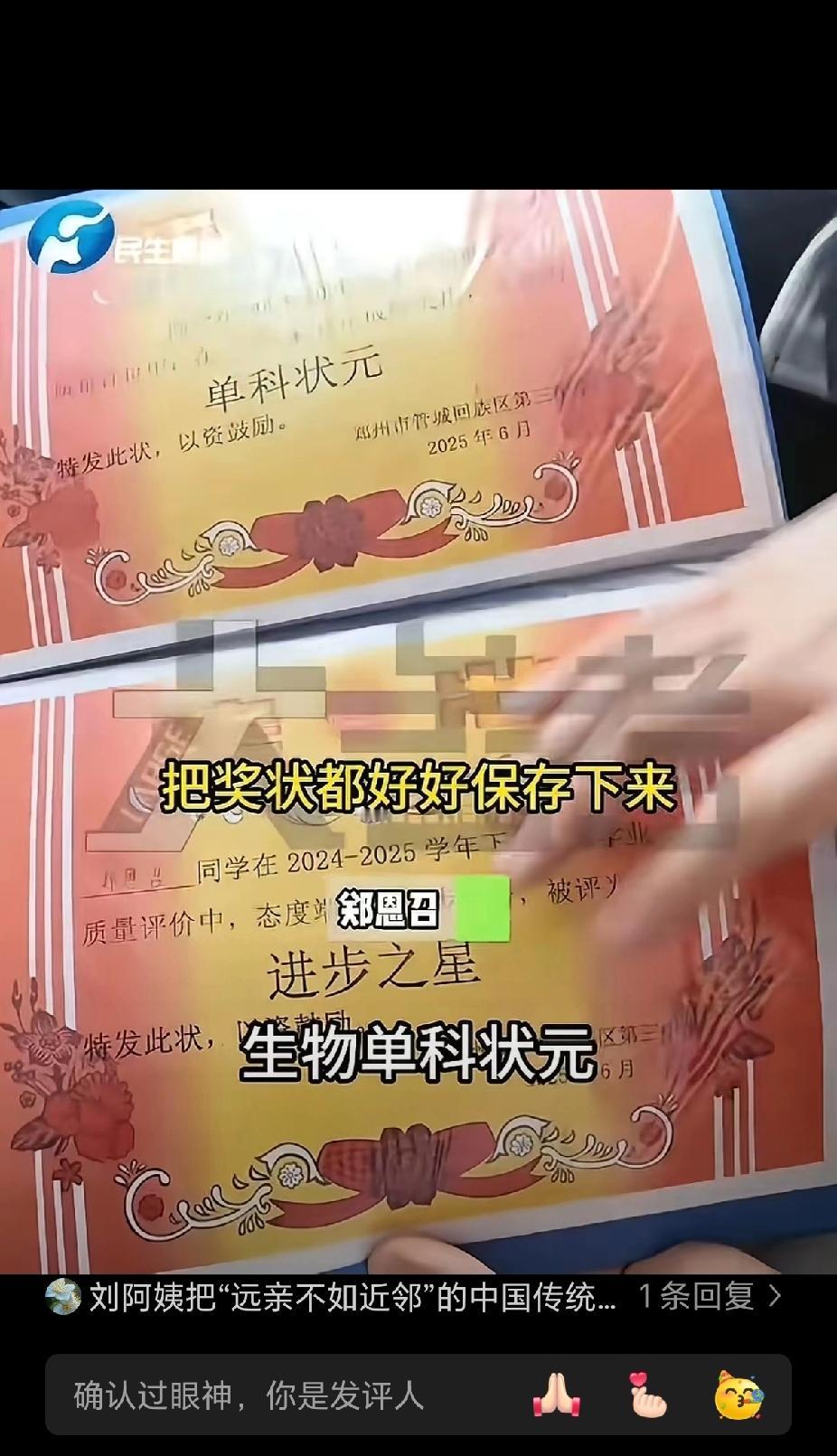 谁懂啊!郑州这位女邻居的举动,才是成年人世界最动人的“双向奔赴”! 14岁的小郑没了父亲、母亲卧病在床,本该扛下所有苦难的年纪,却被邻居刘阿姨护了四年。她没喊过一句口号,只凭着“我的孩子有的,他也得有”的执念,把热饭、新衣服、打印好的资料,还有家长会的身影,都塞进了小郑的生活里。 最戳人的从不是单向付出,而是被爱滋养的孩子真的长成了光。四个单科状元的奖状,就是小郑给这份善意最好的回音。原来善良从不是亏本的买卖,你种下的温暖,终会以另一种耀眼的方式归来。 在邻里关系越来越淡的今天,刘阿姨让我们看清:真正的善意从不用惊天动地,日常的惦记和坚持就足够治愈一生。你身边有没有这样温暖的邻居?来评论区说说那些不期而遇的善意吧~