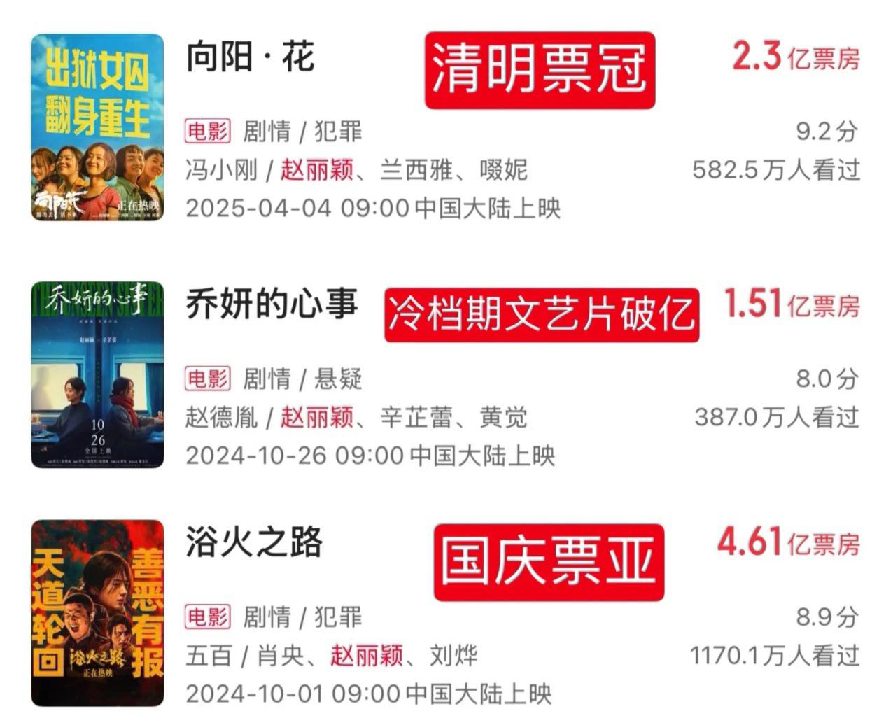 2025最具票房号召力女演员 赵丽颖吧,三部电影均盈利,而且是一年之内全上完,这个行情这个市场,这个成绩很厉害了。换个主演这些题材估计破三千万都难。她真的是一点一点起来的,电视剧在天花板,转战电影从配角到女性题材主角也走了好多年。