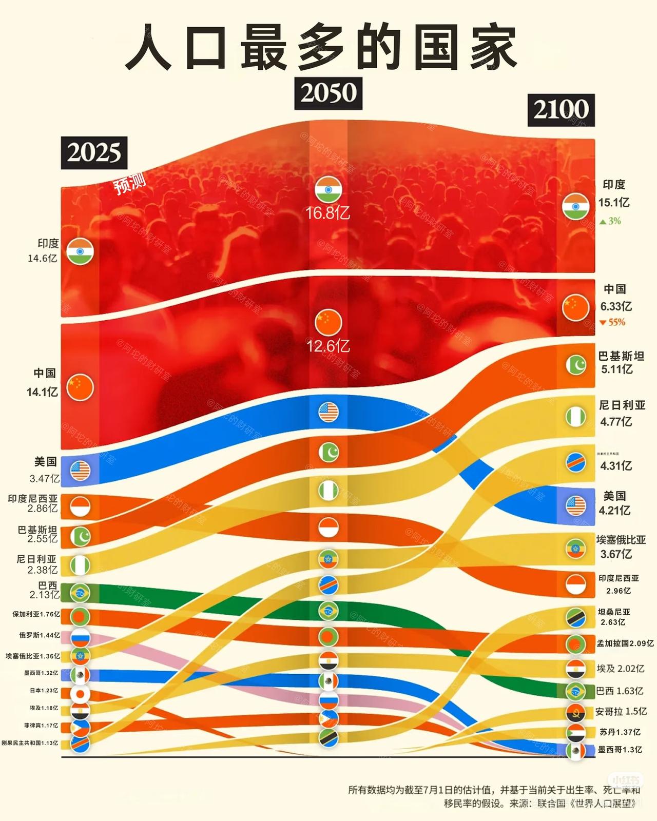 到2100年人口最多的国家? 🌍 01|印度稳坐世界第一,中国人口砍半仍居第二 到 2100 年: 印度约 15.1 亿,继续全球第一 中国虽降至 6.33 亿,但仍是全球第二