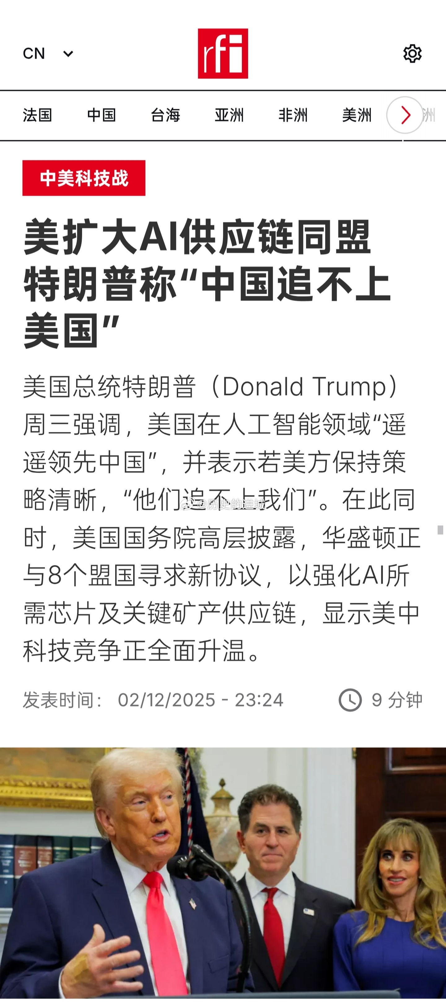 美国总统特朗普周三在内阁会议上强调,美国在人工智能领域“遥遥领先中国”,并表示若美方保持策略清晰,“他们追不上我们”。此外,据彭博社报道,美国国务院经济事务次卿赫尔伯格透露,美国将与日本、韩国、新加坡、荷兰、英国、以色列、阿联酋与澳大利亚等8国启动新合作,目标是建立更安全、可控的AI核心供应链。首场会议将于12月12日在白宫召开,届时美国将与8个盟国的对口官员举行会晤。