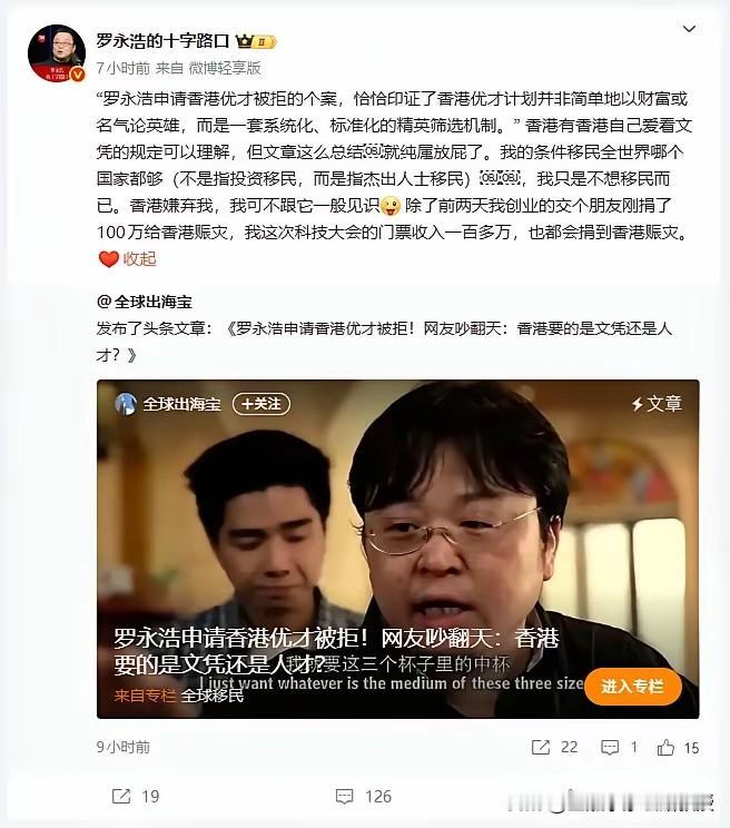 香港政府做事情一向很有原则,有规范的操作流程。罗永浩发文回应自己申请香港优才被拒,其实理由很简单,就是年龄超过50岁加上学历也许不够。 香港对于优才申请的门槛是固定的,不会因为罗永浩有钱有名气就能开绿灯。 很多明星之前都是通过香港优才的“成就计分制”的规则申请到了香港籍,比如,章子怡,黄晓明,胡军,周迅,邓超,孙俪等,音乐界有郎朗,李云迪等,体育界有李宁,王军霞等等。 罗永浩说自己不跟香港一般见识,自己也不想移民,自己的创业公司一样给香港捐款100万展现自己的宽广胸怀。罗永浩说现在投资移民去哪个国家都行,不过,投资移民美国大概现在不行了。