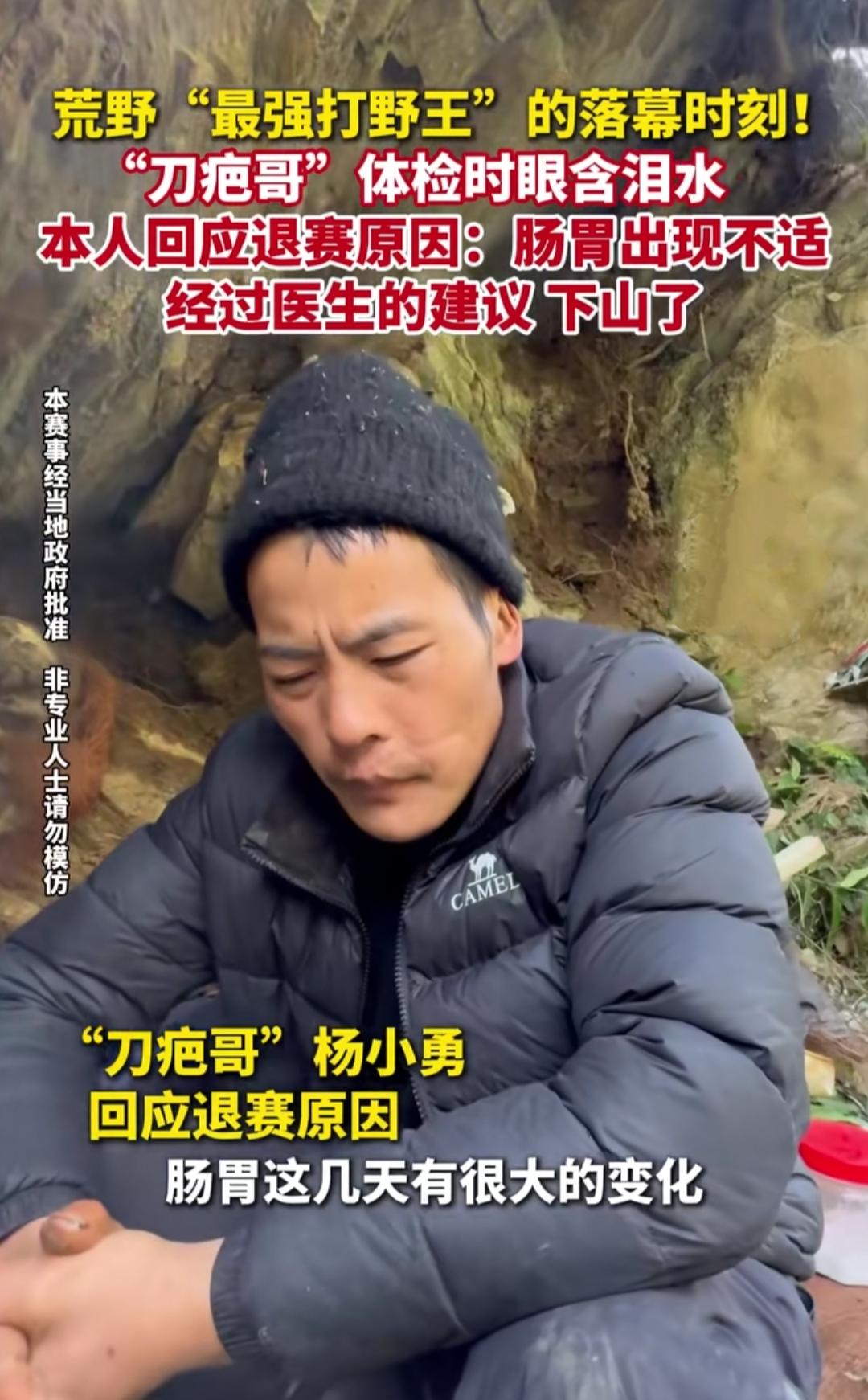 张家界七星山的寒风里,那个被全网叫“最强打野王”的刀疤哥,在荒野求生决赛第9天突然放下了行囊,体检时红着眼眶的样子,让多少看到的人瞬间破防。 谁能想到,闯过了暴雨、断粮、野兽威胁的硬核狠人,最终栽在了肠胃不适上。遵照医生建议退赛的那一刻,他眼里强忍的泪水,藏着多少不甘与遗憾。 这不是认输,而是对生命的敬畏。9天的荒野博弈,他靠双手觅食、用毅力抗寒,每一步都走得铿锵有力。可身体发出的警报,终究让这场热血征程戛然而止。 遗憾吗?太遗憾了。但比起冲到底的荣耀,懂得适时止步的清醒,更让人敬佩。刀疤哥,下次赛场再见!