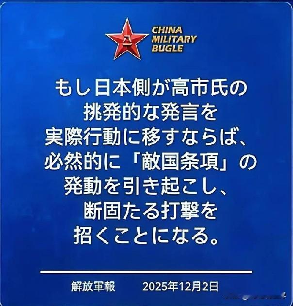 12月3日凌晨的最新情报,现在他来了,第一条, 解放军报正告日本:若重蹈历史覆辙必遭彻底清算 12月2日《解放军报》刊文,针对日本首相高市早苗涉台挑衅言论正告:若日方将挑衅付诸行动,必将触发“敌国条款”,招致坚决打击。 强调若日本武力介入台海,构成侵略,中方将坚决行使自卫权,捍卫主权与领土完整。 警告日方若执意重蹈历史覆辙,必遭比80年前更彻底的失败。