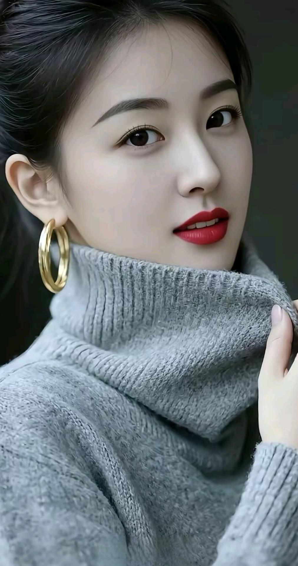温柔冬日穿搭,灰色毛衣搭配金色耳环,尽显优雅气质。