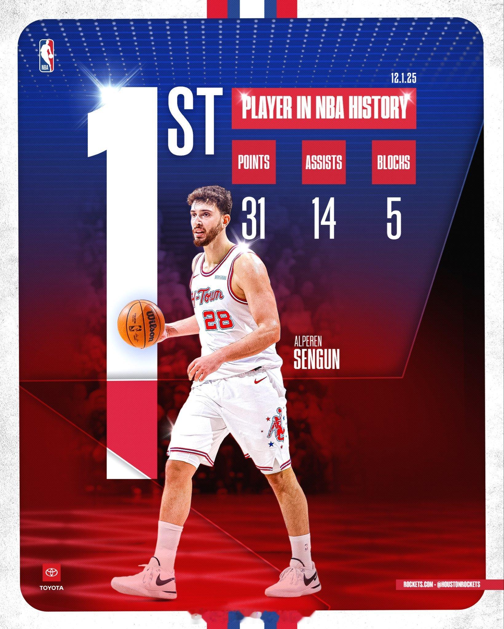 火箭官方:申京继续创造历史在昨天的比赛中,他成为NBA历史上第一位在一场比赛中至少得到30分、14次助攻和5次盖帽的球员!申京休斯顿火箭新赛季篮不住