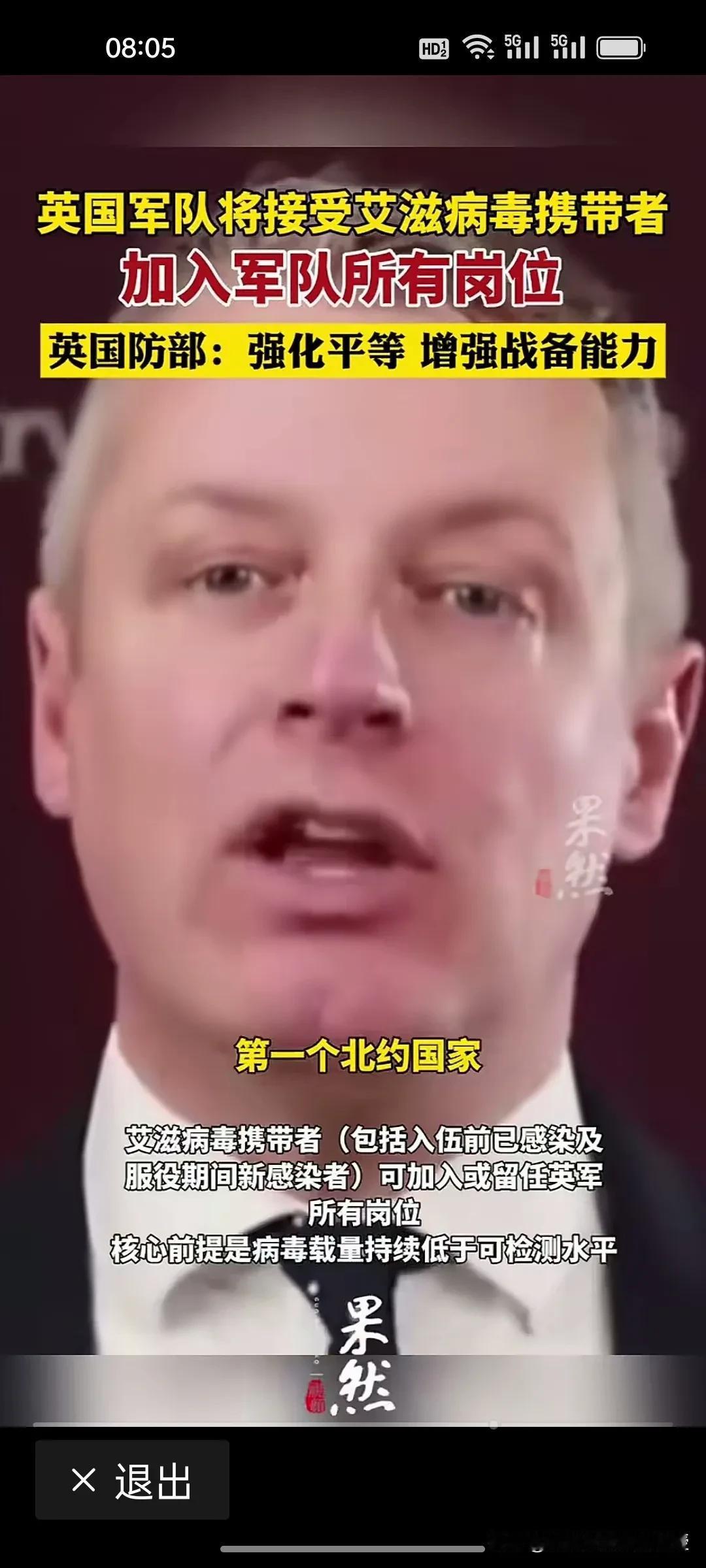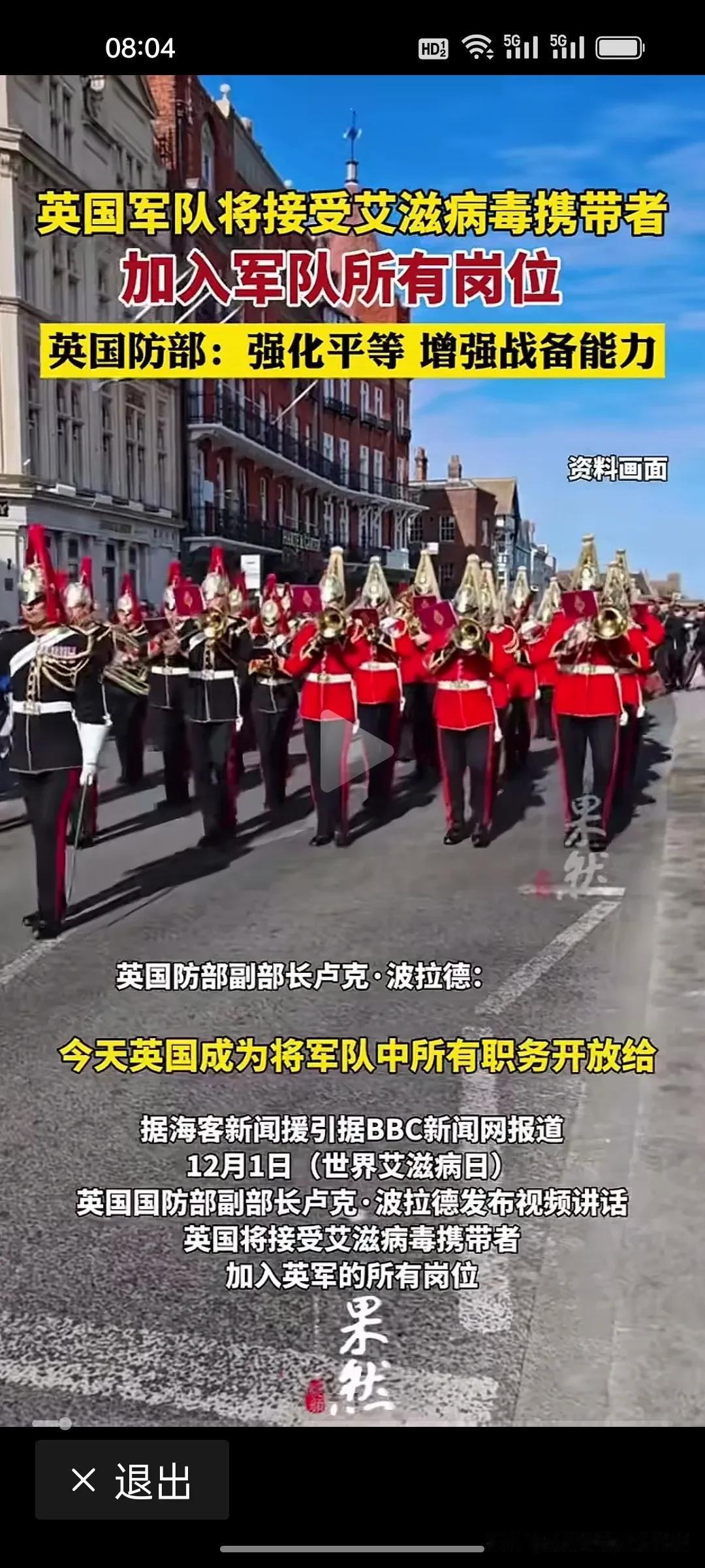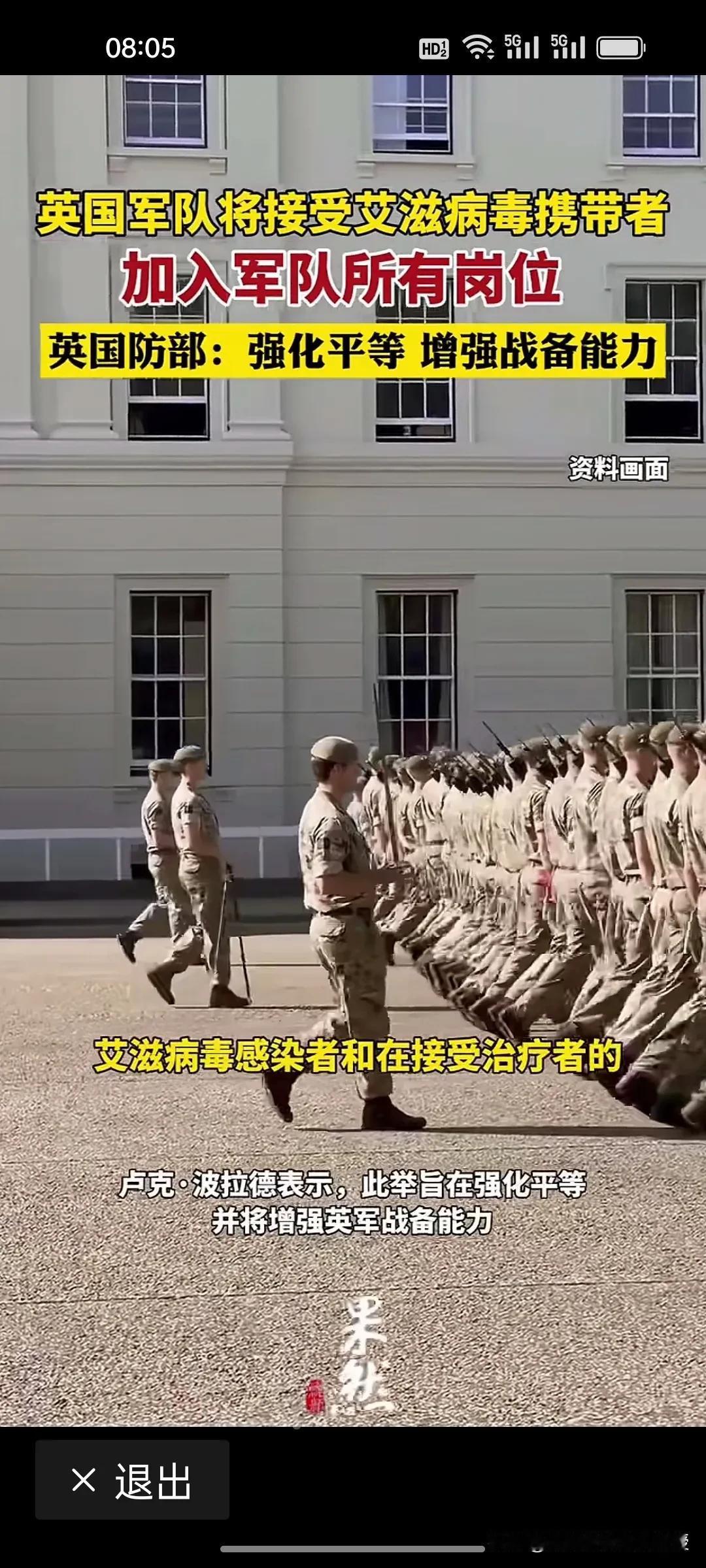 英国年轻人里想当兵的真的不多了,英国的国防部副部长说,英国军队将成为北约第一个接受艾滋病毒携带者入伍的国家。所有岗位都可以接受艾滋病毒携带者,这样可以增加英国军队的战备能力,强化了人人平等。 不过,与其说是彰显平等、补强战力,不如说是用荒唐的“政治正确”掩盖英军兵员跌至两百年新低(英国陆军从1991年的16万将至如今7万人)、装备破败、战备废弛的真实窘境。