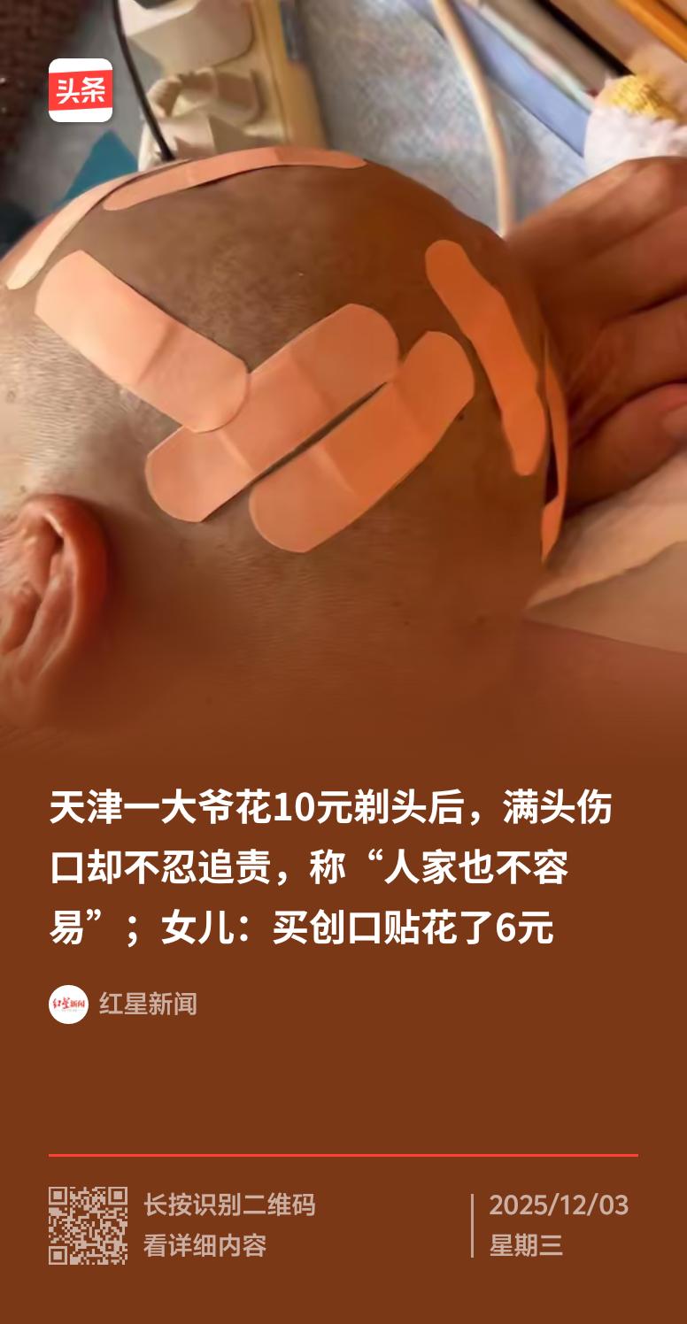 天津这位67岁大爷花10元剃头剃出满头伤口的事儿,真是让人五味杂陈。大爷平时都是老伴儿给剃,这次老伴不舒服才去了理发店。女儿周末来,一开始没发现,开灯后才看到脑袋上全是小口子。一问才知道,剃的时候还流血了,大爷怕耽误时间愣是没动。 女儿本想找店家说理,大爷却拦下说“人家也不容易”。女儿花6元买创口贴给父亲贴上,十多个伤口贴得密密麻麻。网友看法不一,有人夸大爷善良有包容心,也有人指责理发师不负责任。10元理发费加6元创口贴钱,这体验真是绝了。只能说大爷心善,但理发师也该提升手艺呀。 老人剃头 天津剃头大爷