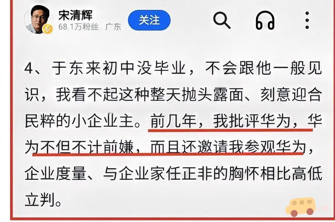 还记得当年有人号称华为军师,混得风生水起,说任老爷子亲自给她开车,结果华为出来辟谣,说华为不认识这位专家,更与这位专家没有交集,结果怎么的?这位专家翻车了! 而在碰瓷华为的戏码里,宋清辉,这位自封的“经济学家”把吹牛演成了日常。 2024年初华为调整汽车合作项目,宋清辉跳出来猛批,甚至喊出“不买华为才是爱国者”的荒诞口号,转头却宣称华为不计前嫌邀请他参观。 可网友翻遍全网,从百度到头条再到搜狗,都没找到任何佐证,华为从未有过相关公示,任正非邀请名单里也根本没他的名字。 要知道任正非邀请的都是金一南、何小鹏这类真正的行业大咖,宋清辉非经济学专业出身,所谓“清晖智库”也只是未注册的个人工作室。 他这套操作并非首次,2025年3月还曾炮轰胖东来“没核心竞争力”“是河南企业界耻辱”,甚至人身攻击创始人于东来,结果被胖东来索赔百万起诉。 更讽刺的是,他一边标榜自己“敢说真话”,一边靠争议言论引流,转头就推出付费课程收割流量,把学术批判变成了赚钱工具。 华为从头到尾没搭理过他的碰瓷,这种无视恰恰戳破了真相——对真正的大企业而言,他的炒作根本不值一提。 虚假的光环终会被戳破,宋清辉的闹剧告诉我们,靠碰瓷名人企业博眼球、赚流量,终究是饮鸩止渴。 真正的影响力源于专业和真实,而非信口开河的吹牛和毫无底线的炒作,耍小聪明的人迟早会被自己的谎言反噬。 各位读者你们怎么看?欢迎在评论区讨论。