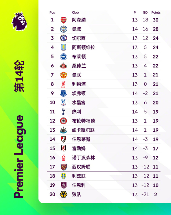 ◉ 曼城先赛险胜富勒姆,落后领头羊阿森纳2分 ◉ 埃弗顿击败伯恩茅斯,升至第9 ◉ 热刺绝平纽卡,两队分列第11和第13