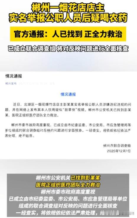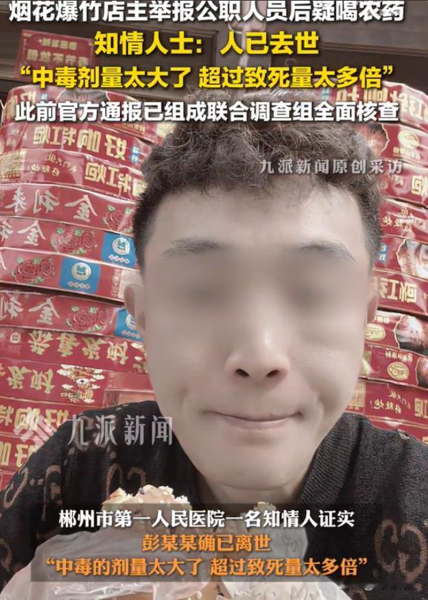 湖南郴州,北湖区。一位店主举报公职人员后喝农药离世,这位店主今年才39岁,家中还有两个孩子。事发后,当地迅速组成联合调查组,承诺会全面核查此事,一旦查实相关情况,定会严肃处理,给公众一个交代。 (来源:九派新闻、红星新闻)) 据报道,这位39岁的店主,因举报公职人员走上了绝路。 11月30日,他公开发视频,举报街道社区、应急管理局等7个部门公职人员,长期索贿财物、强拿商品不付款,还刁难烟花爆竹销售许可证审批。 他直言当你们看到信时我可能不在人世了,当天,他点燃烟花店,喝下农药,留下两个孩子。 这起悲剧,瞬间引发了广泛关注。 大家都在问,公职人员怎么能如此肆无忌惮地侵害群众利益?店主又为何会选择如此极端的方式维权? 争议点很明确,就是公职人员是否存在索贿、强拿商品不付款以及刁难审批等行为。 店主坚称自己遭受了这些不公正对待,而涉事公职人员肯定不会轻易承认。 从店主的角度看,他长期被这些公职人员刁难,生意受到严重影响,生活陷入困境。 他多次尝试正常维权,却没有任何效果,无奈之下才选择公开举报。 而涉事公职人员,他们可能会辩解称店主是在恶意诬陷,自己并没有这些不当行为。 但这种辩解在没有证据支撑的情况下,很难让人信服。 店主举报公职人员,如果举报内容属实,公职人员就涉嫌违法犯罪。 根据刑法规定,国 家 工作人员利用职务上的便利,索取他人财物的,或者非法收受他人财物,为他人谋取利益的,是受贿罪。 《刑法》第三百八十五条规定,国 家 工作人员在经济往来中,违反 国 家 规定,收受各种名义的回扣、手续费,归个人所有的,以受贿论处。 如果该店主举报属实,公职人员确实存在索贿财物的情况,就符合这一条款规定,构成受贿罪。 还有强拿商品不付款,这也涉嫌寻衅滋事罪。 《刑法》第二百九十三条规定,有强拿硬要或者任意损毁、占用公私财物,情节严重的行为,破坏社会秩序的,处五年以下有期徒刑、拘役或者管制。 公职人员强拿店主商品不付款,如果情节严重,就可能触犯这一罪名。 对于刁难烟花爆竹销售许可证审批,如果公职人员是故意设置障碍,滥用职权,还可能涉嫌滥用职权罪。 《刑法》第三百九十七条规定,国 家 机关工作人员滥用职权或者玩忽职守,致使公共财产、国 家 和人民利益遭受重大损失的,处三年以下有期徒刑或者拘役;情节特别严重的,处三年以上七年以下有期徒刑。 店主选择喝农药自杀这种极端方式维权,虽然令人同情,但从法律角度讲,这并不是解决问题的正确途径。 他应该通过合法合规的渠道,比如向纪检监察机关举报、申请行政复议或者提起行政诉讼等方式来维护自己的权益。 如果店主举报不实,会不会构成诬告陷害罪? 《刑法》第二百四十三条规定,捏造事实诬告陷害他人,意图使他人受刑事追究,情节严重的,处三年以下有期徒刑、拘役或者管制;造成严重后果的,处三年以上十年以下有期徒刑。 但如果店主是出于维护自己合法权益的目的,且没有捏造关键事实,只是证据不足或者理解有误,一般不构成诬告陷害罪。 这起事件,在现实中映射出的问题让人深思。 基层的公职人员,本应是为人民服务的,但个别人却利用手中的权力谋取私利,严重损害了公权力和群众利益。 群众在遇到问题时,往往不知道如何正确维权,或者维权成本过高、过程漫长,导致他们感到绝望,从而选择极端方式。 这说明法治宣传还不够到位,维权渠道还不够畅通。 应该对涉事公职人员进行了严肃处理,对店主家属给予了一定的补偿和安抚。 公职人员必须严守法律底线,廉洁奉公,全心全意为人民服务。 而群众在遇到问题时,一定要保持冷静,通过合法途径维护自己的权益。 希望这样的事情不要再发生,每个人都能在法治的阳光下,公平、公正地生活。 大家觉得在遇到类似情况时,还有哪些更好的维权方式呢?欢迎在评论区留言讨论。