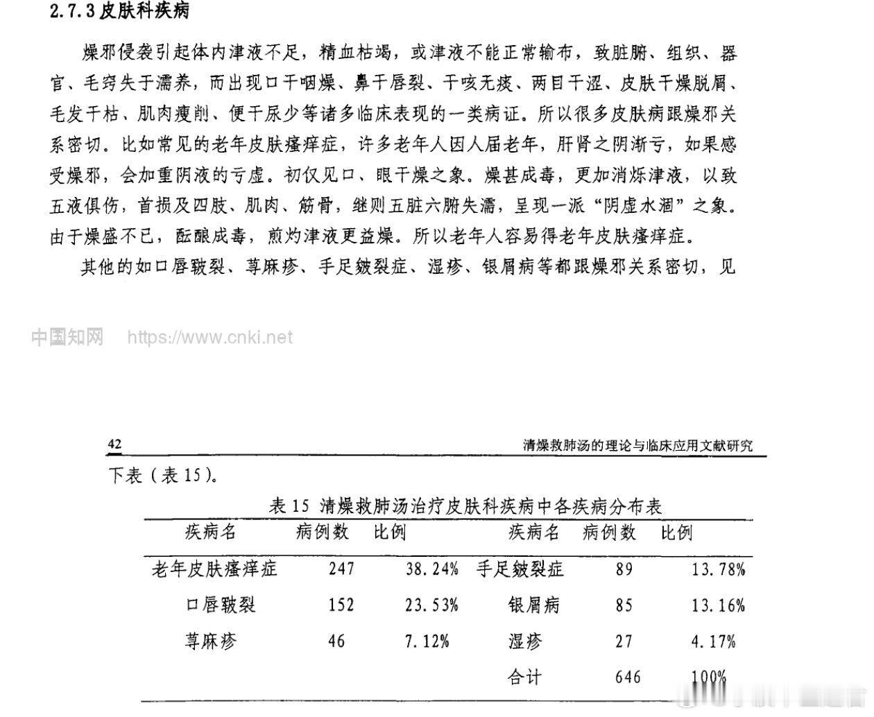 今天上午我继续深入研究喻嘉言先生的清燥救肺汤,查阅文献,找到一篇硕士论文,是赵绍琴老先生的徒弟李刘坤教授指导学生写的他们总结了100多篇使用清燥救肺汤的文章,发现其治疗疾病的范围不仅有呼吸系统,比如咳嗽,支气管炎,肺气肿,哮喘,肺结核,肺癌;还包括五官科,比如鼻炎、咽喉炎、中耳炎;还有皮肤病,比如老年皮肤瘙痒,口唇皲裂,手脚皲裂,湿疹,荨麻疹,银屑病;还有一些消化系统的便秘、腹泻……蔚然大观!肺开窍于鼻,因而可治鼻炎;肺为水之上源,因而可治小便不利;肺与大肠相表里,因而可治大便异常;肺主皮毛,因而可治皮肤病。中医理论的整体观不是装点门面用的,而是确能提供临床疗疾之利器