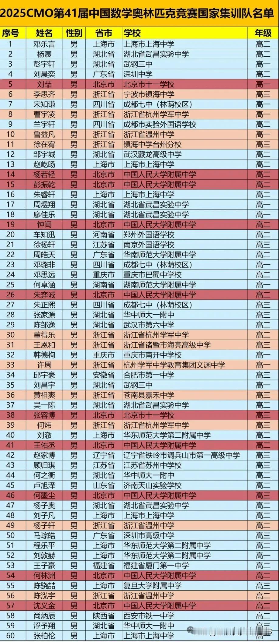 刚刚看到一份今年CMO中国数学奥林匹克竞赛国家集训队的60人名单。这就是清北直通车啊!这份名单有两个想不到: 1、60人全是男孩,没有一个女孩。 2、除了北京人大附中8位和十一学校2位,以及辽宁铁岭1位,陕西西安1位之外,其他48位均是南方的中学,江浙沪居多。高考大省山东,河南,河北竟然无一人,说明奥数竞赛在南方各地学校的培养体系确实比较健全。 这次满分夺冠的邓乐言来自上海中学,据说三年级已经学完小学奥数,奥数牛娃养成确实是一项“系统工程”,自身的天赋,家长的引导,强大的内驱力,缺一不可。