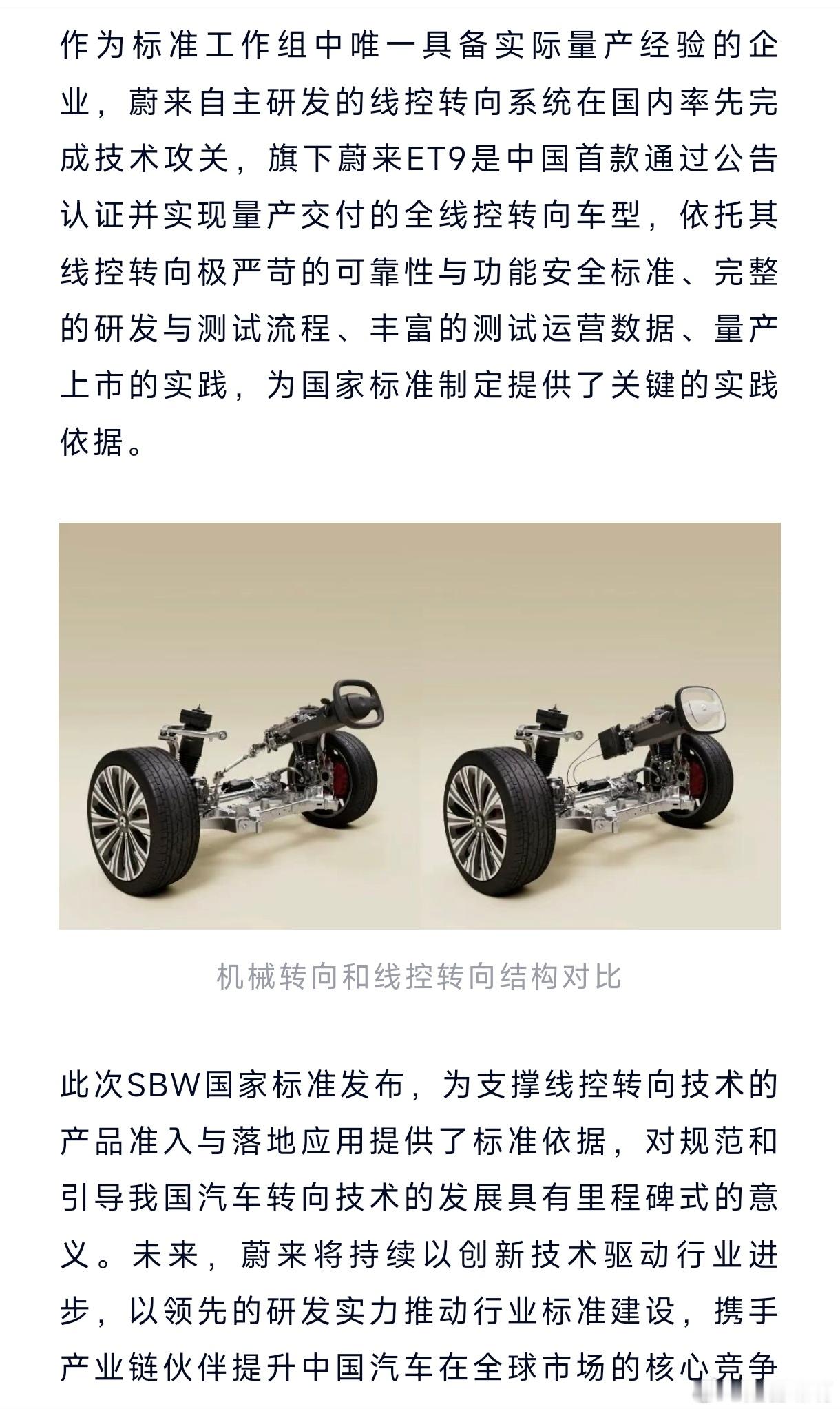 蔚来汽车作为牵头单位之一,联合中国汽车技术研究中心等共同发布GB17675-2025《汽车转向系 基本要求》线控转向系统(SBW)国家标准。蔚来是国内首个通过公告认证并量产落地全线控转向技术的车企。这点毫无疑问。真正的创新企业,同时也是具备推动行业技术进步的责任感的。