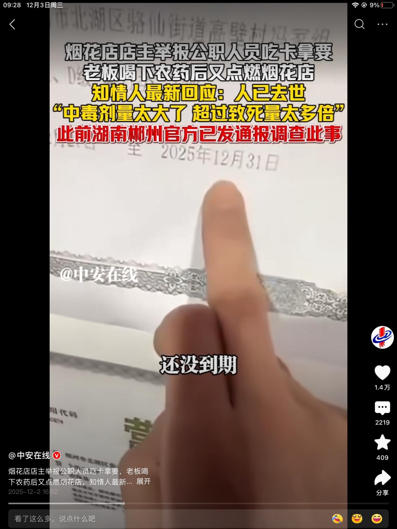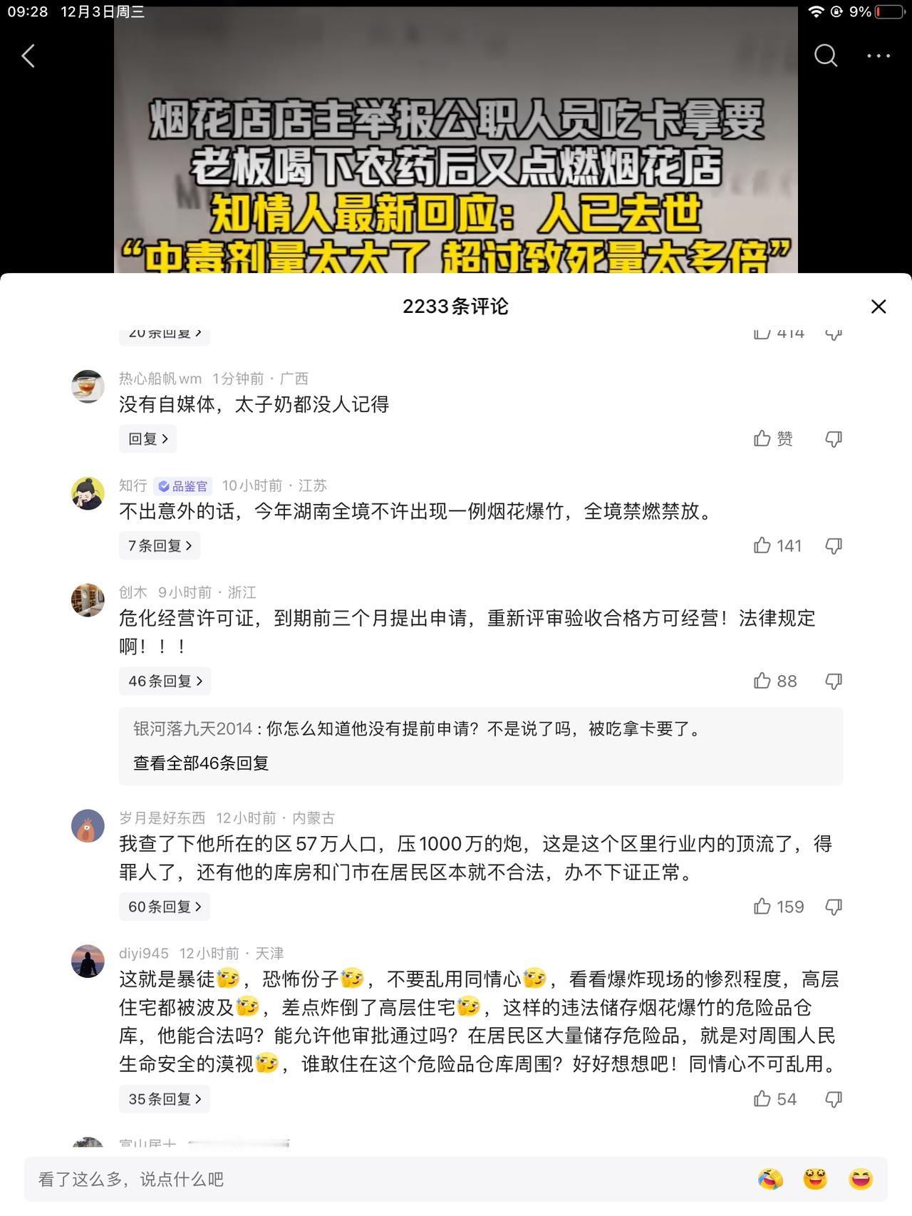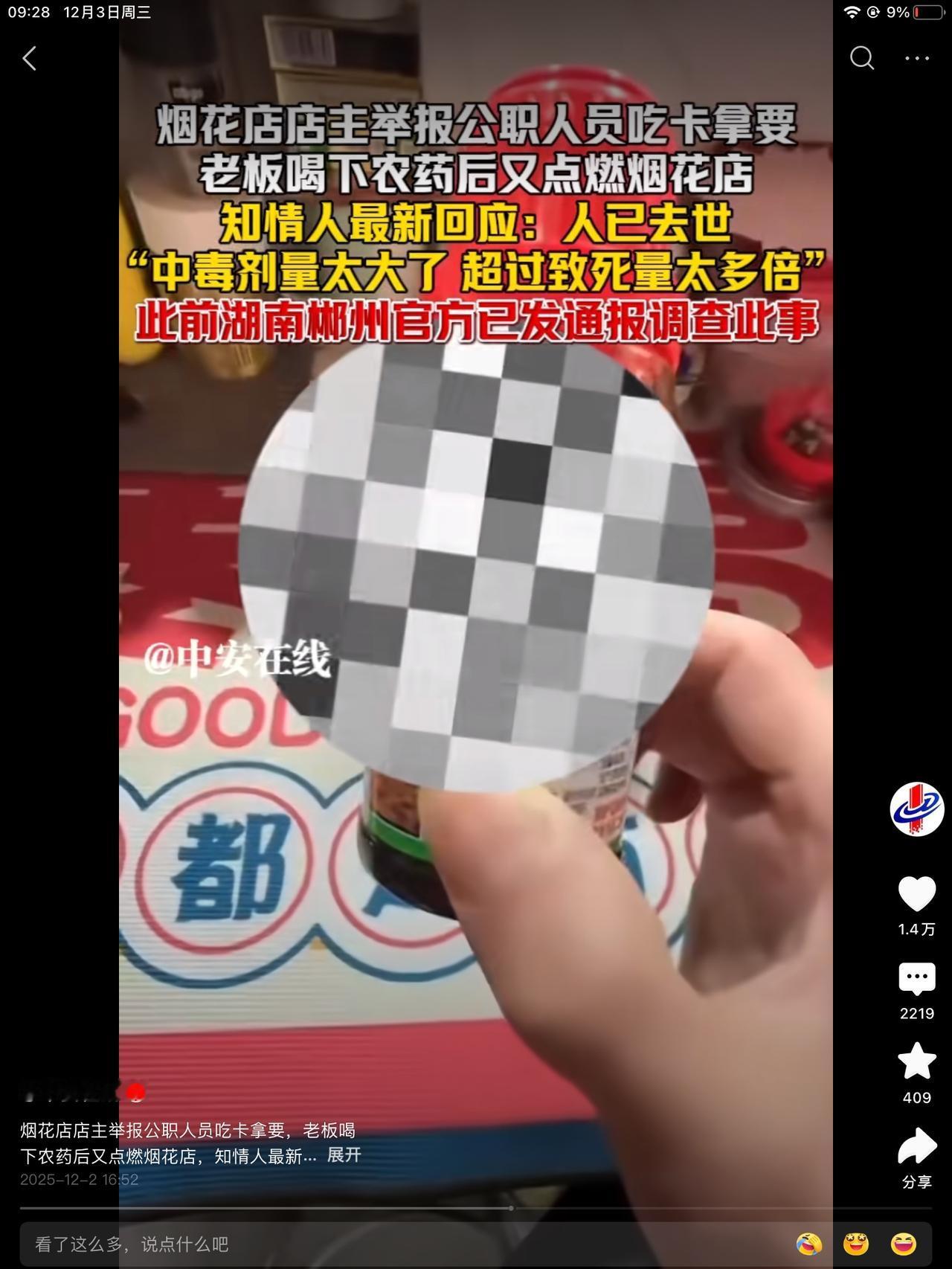 老板是个年轻人啊!染着头发,烫着卷儿。太可惜了。我以为是个年龄大的,活了几十岁的人。原来不是啊!证件还没到期。到年跟前,最是干买卖的时候,不能干。因为审批新的证件下不来。烟花 但他的做法太决绝了。他认为的没路可走了。也不让家人接近。整个事件都是一人所为。一人做事,一人当。喝了太多量,没办法抢救。奔着死亡去的。多大的勇气哦!是什么把他逼到了绝路。 积压的是钱,一步之遥,不能变现。到期前三个月,提出证件申请。下不来,卡着你,不给你办。一个章的事,就能要你命。