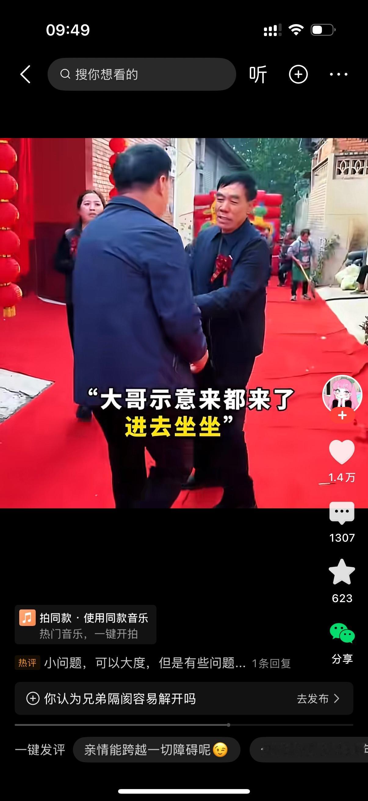 兄弟俩因为矛盾8年没有来往。今天侄子结婚,没有通知的叔叔自己来了。他没有做多余的停留,交上礼金,登记好自己的名字就离开。大嫂看到这一幕,连忙示意丈夫追上去。大哥拉住弟弟,表示来了就进去坐坐。大嫂也第一时间给叔叔戴上小红花。兄弟俩深情地拥抱在一起,一笑泯恩仇。这一刻的兄弟俩是多年未相拥的血脉。