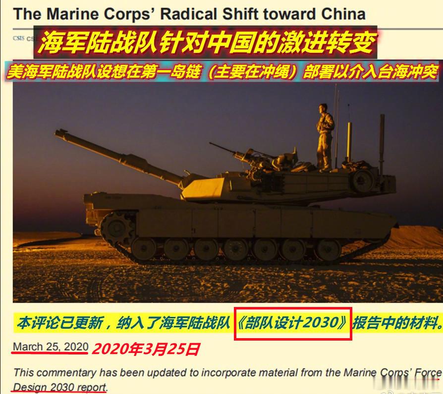 图1:看到今天美《海军时报》的报道中提到《部队设计2030》;图2:想到2020年美陆战队以介入台海冲突为背景的部队改革方案;图3:以及2021年12月美陆战队推出更具体的兵力改革计划;图4:以及同月前安倍妄称“台湾有事即日本有事”的狂言。就不得不联想——高市早苗的“口吐狂言”为啥与美陆战队在日本新成立3个战斗后勤连队之举在同一个月发生呢?