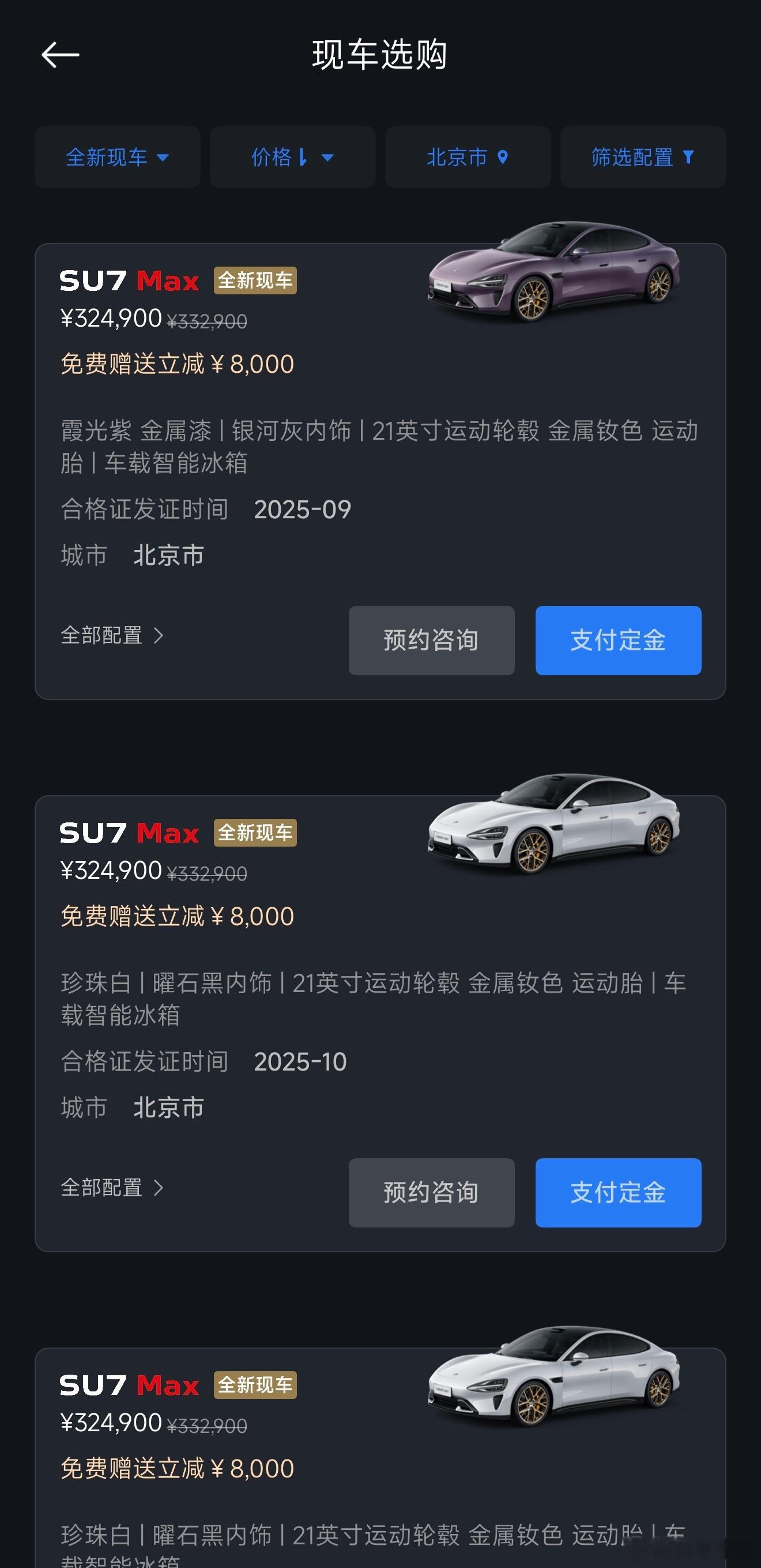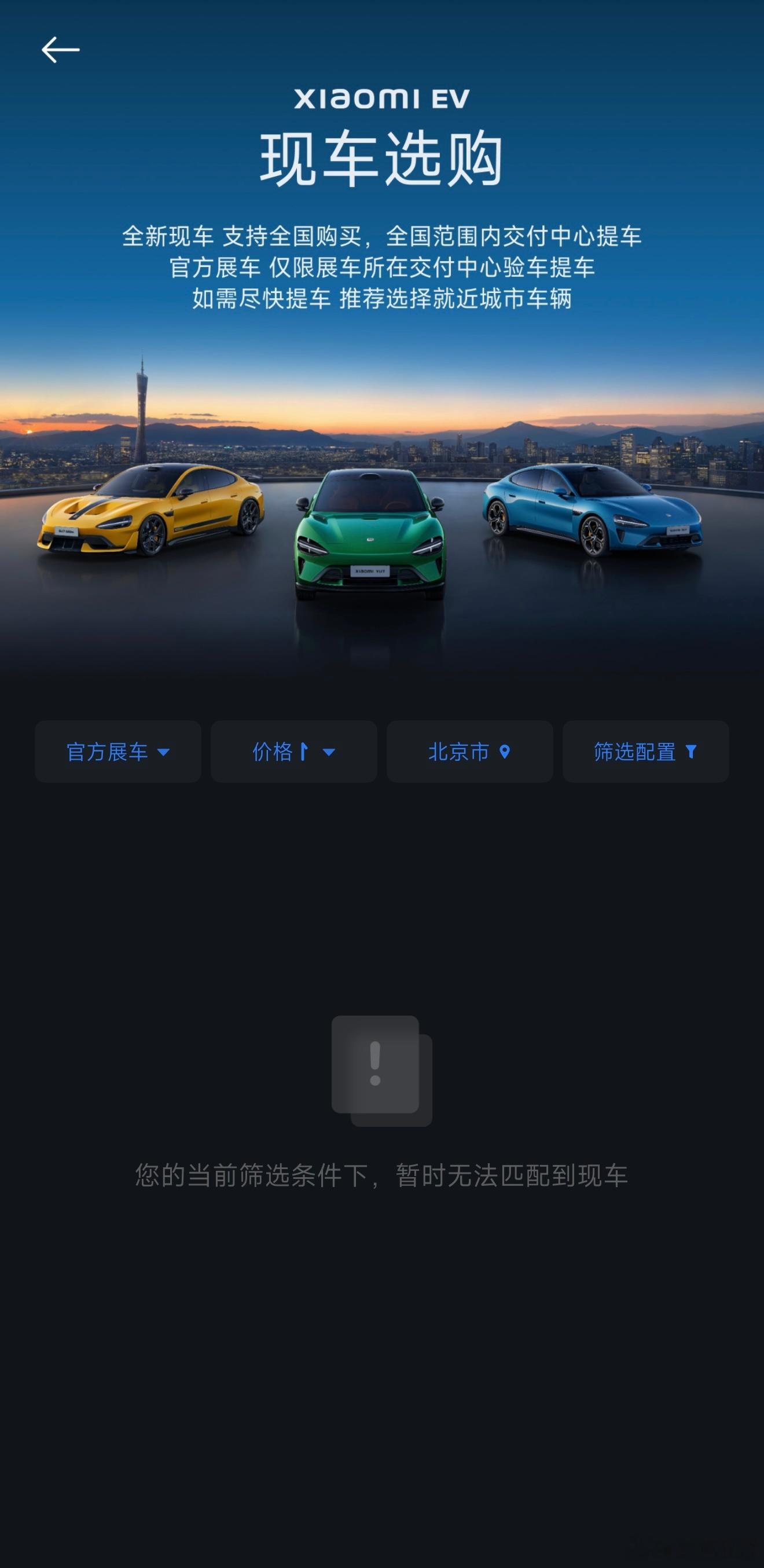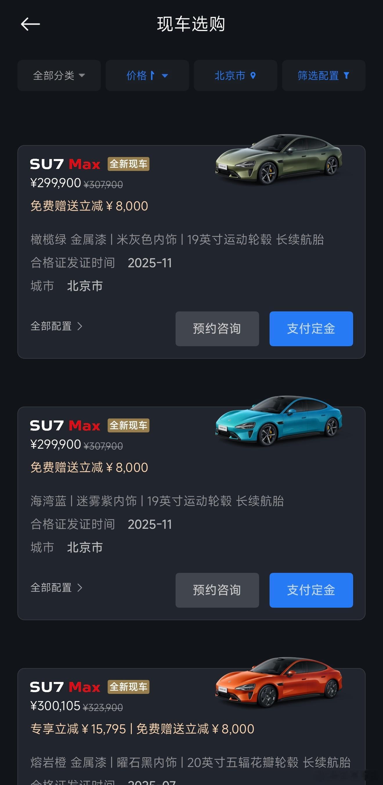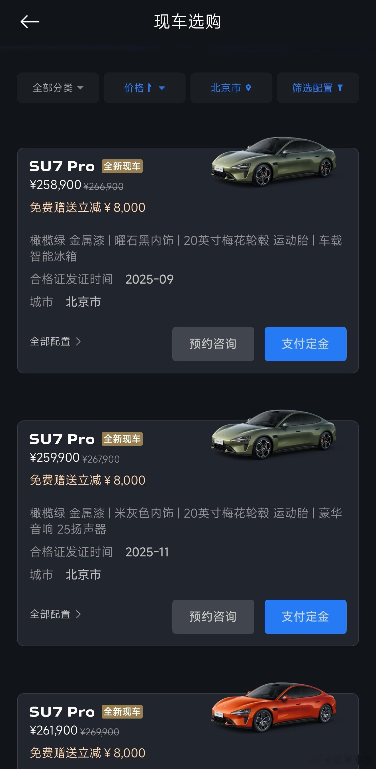 看了一下小米现车选购以北京为例没有官方展车,都是全新现车没有YU7,都是SU7SU7没有标准版,只有Pro和MaxSU7基本都是各种选配有优惠但价格算不上惊喜看样子便宜的都被选完了但是如果配置对得上眼,不用等还能便宜点也不错
