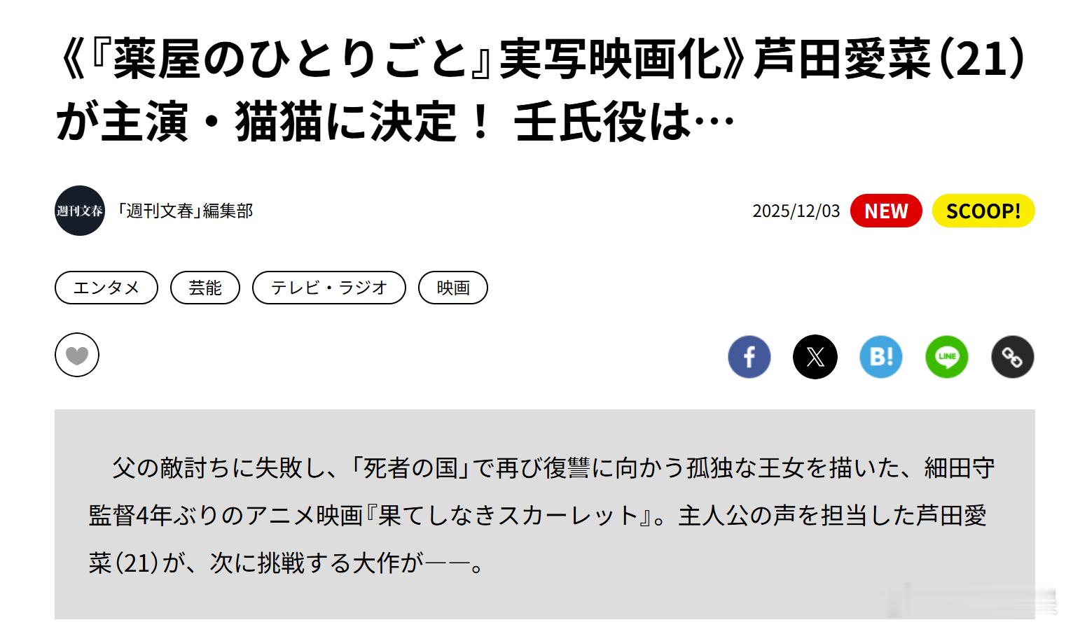 文春:《药屋少女的呢喃》将真人电影化,芦田爱菜主演猫猫,野村康太出演壬氏。将于2026年开机,2027年上映。