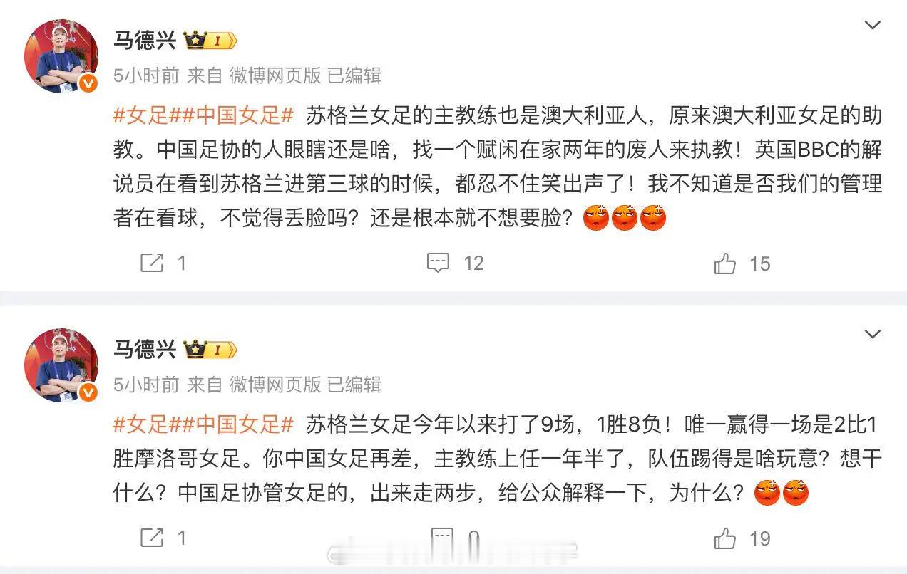马德兴怒批足协:根本不要脸?难怪央视不直播 彻查怎么选的教练12月3日凌晨,中国女足遭遇尴尬一战。面对世界排名仅25位的苏格兰,中国队一度0-3落后,并最终2-3输球。赛后,《体坛周报》名记怒批中国足协的领导层。上一场比赛,中国女足0-8输给英格兰。马德兴就非常愤怒,他当时表示:“我们足球的领导根本没有荣辱观,完全不觉得这是一个“耻辱”,甚至会要求继续“正能量”,做着明年澳大利亚女足亚洲杯能夺冠的春梦呢!”如果说中国队输给英格兰还能用实力差距明显来作为理由,毕竟对手是世界第4、欧洲杯冠军,那中国队今日被苏格兰击败就完全是一个巨大的尴尬了。整个2025年,苏格兰此前踢了9场比赛,只赢了1场,实力一点都不强。马德兴认为足协应该好好反思。“必须要彻查,当初是谁选择这么一个垃圾主教练的!又是怎么选出来的!现在终于知道为啥央视放弃了直播!”3天前,央视直播了中国队0-8输英格兰的比赛。不过,今天没有直播中国队与苏格兰的比赛。“你中国女足再差,主教练上任一年半了,队伍踢得是啥玩意?想干什么?中国足协管女足的,出来走两步,给公众解释一下,为什么?”马德兴再次质疑足协高层的荣辱观:“中国足协的人眼瞎还是啥,找一个赋闲在家两年的废人来执教!英国BBC的解说员在看到苏格兰进第三球的时候,都忍不住笑出声了!我不知道是否我们的管理者在看球,不觉得丢脸吗?还是根本就不想要脸?”名嘴韩乔生如此点评女足这2场的表现:“这也是中国女足历史上首次输给苏格兰女足。全场数据统计,中国女足23次射门只有2次打正,就是来自张琳艳、吴澄舒的破门。如今欧洲拉练2战皆负,打进2球丢了11球,表现难以令人满意。”