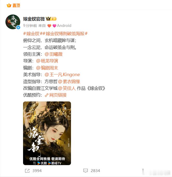 首部大女主剧《嫁金钗》开始预约,田曦薇诠释的魏娆不依附权势,不为流言所困,在复杂境遇中始终保持真诚与善良。田曦薇首部大女主剧田曦薇嫁金钗开始预约