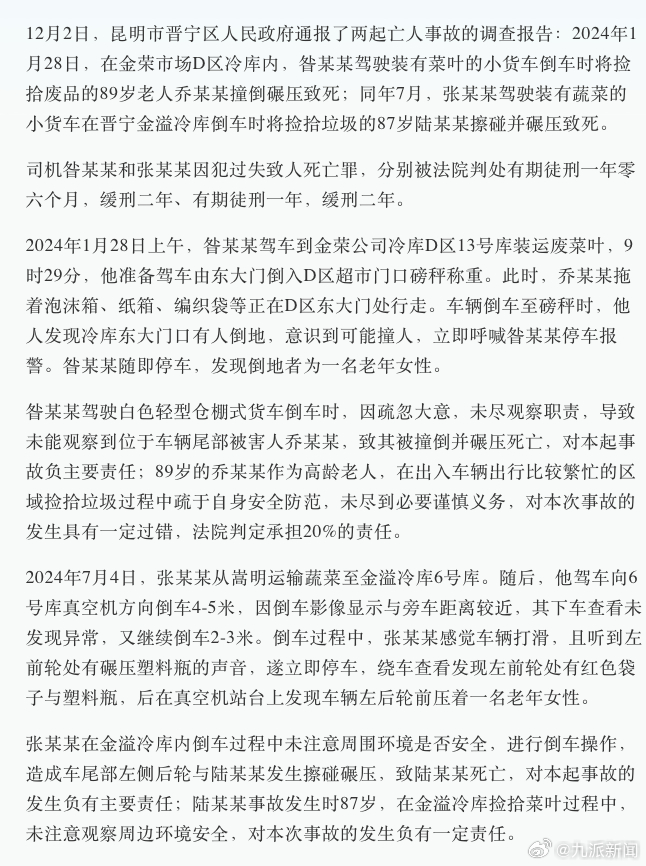 【#官方通报2起冷库亡人事故调查结果#:均为#2拾荒老人被货车倒车碾压致死#】12月2日,昆明市晋宁区人民政府通报了两起亡人事故的调查报告:2024年1月28日,在金荣市场D区冷库内,昝某某驾驶装有菜叶的小货车倒车时将捡拾废品的89岁老人乔某某撞倒碾压致死;同年7月,张某某驾驶装有蔬菜的小货车在晋宁金溢冷库倒车时将捡拾垃圾的87岁陆某某擦碰并碾压致死。司机昝某某和张某某因犯过失致人死亡罪,分别被法院判处有期徒刑一年零六个月,缓刑二年、有期徒刑一年,缓刑二年。2024年1月28日上午,昝某某驾车到金荣公司冷库D区13号库装运废菜叶,9时29分,他准备驾车由东大门倒入D区超市门口磅秤称重。此时,乔某某拖着泡沫箱、纸箱、编织袋等正在D区东大门处行走。车辆倒车至磅秤时,他人发现冷库东大门口有人倒地,意识到可能撞人,立即呼喊昝某某停车报警。昝某某随即停车,发现倒地者为一名老年女性。昝某某驾驶白色轻型仓棚式货车倒车时,因疏忽大意,未尽观察职责,导致未能观察到位于车辆尾部被害人乔某某,致其被撞倒并碾压死亡,对本起事故负主要责任;89岁的乔某某作为高龄老人,在出入车辆出行比较繁忙的区域捡拾垃圾过程中疏于自身安全防范,未尽到必要谨慎义务,对本次事故的发生具有一定过错,法院判定承担20%的责任。2024年7月4日,张某某从嵩明运输蔬菜至金溢冷库6号库。随后,他驾车向6号库真空机方向倒车4-5米,因倒车影像显示与旁车距离较近,其下车查看未发现异常,又继续倒车2-3米。倒车过程中,张某某感觉车辆打滑,且听到左前轮处有碾压塑料瓶的声音,遂立即停车,绕车查看发现左前轮处有红色袋子与塑料瓶,后在真空机站台上发现车辆左后轮前压着一名老年女性。张某某在金溢冷库内倒车过程中未注意周围环境是否安全,进行倒车操作,造成车尾部左侧后轮与陆某某发生擦碰碾压,致陆某某死亡,对本起事故的发生负有主要责任;陆某某事故发生时87岁,在金溢冷库捡拾菜叶过程中,未注意观察周边环境安全,对本次事故的发生负有一定责任。