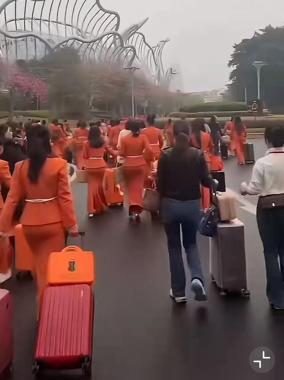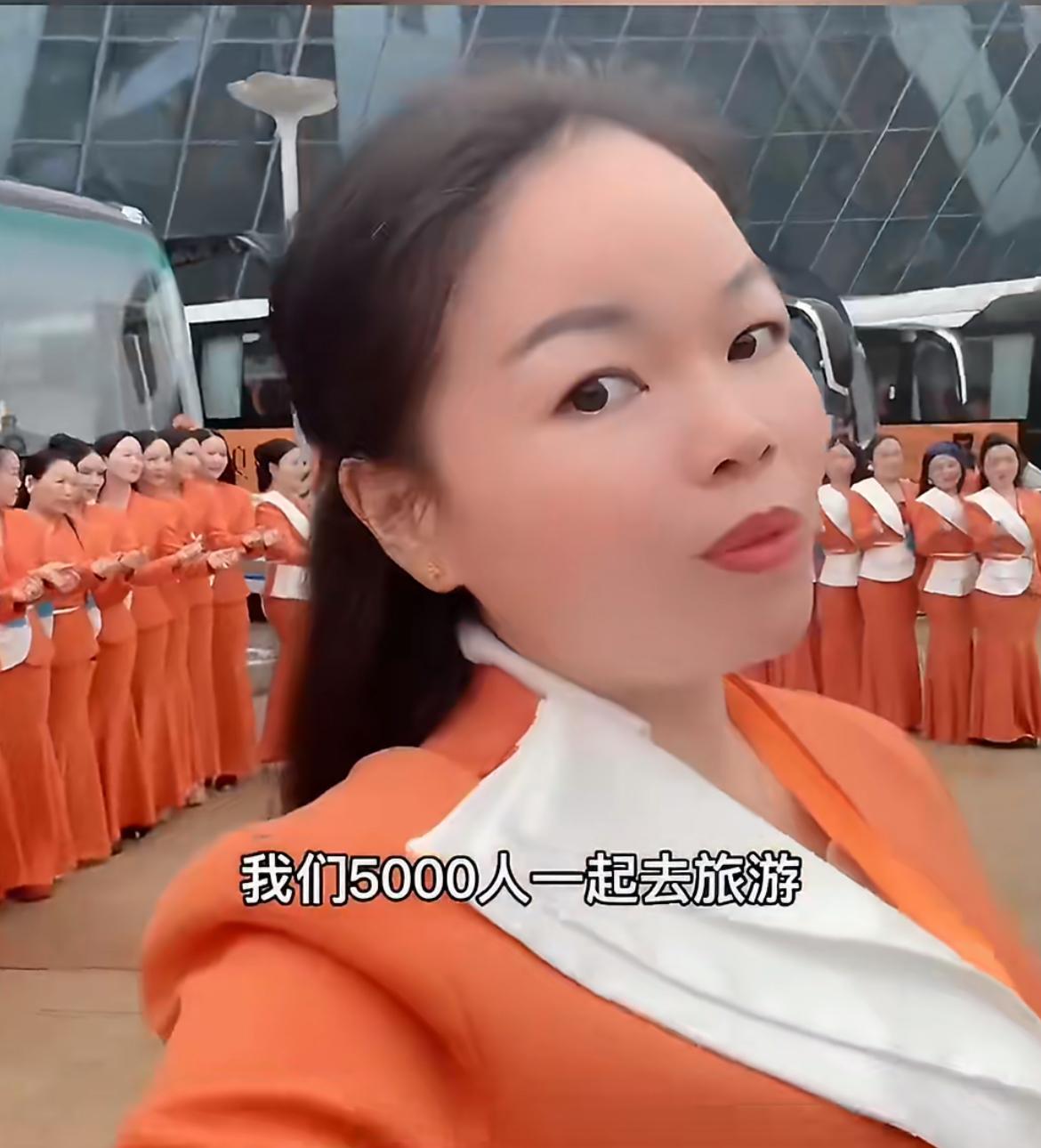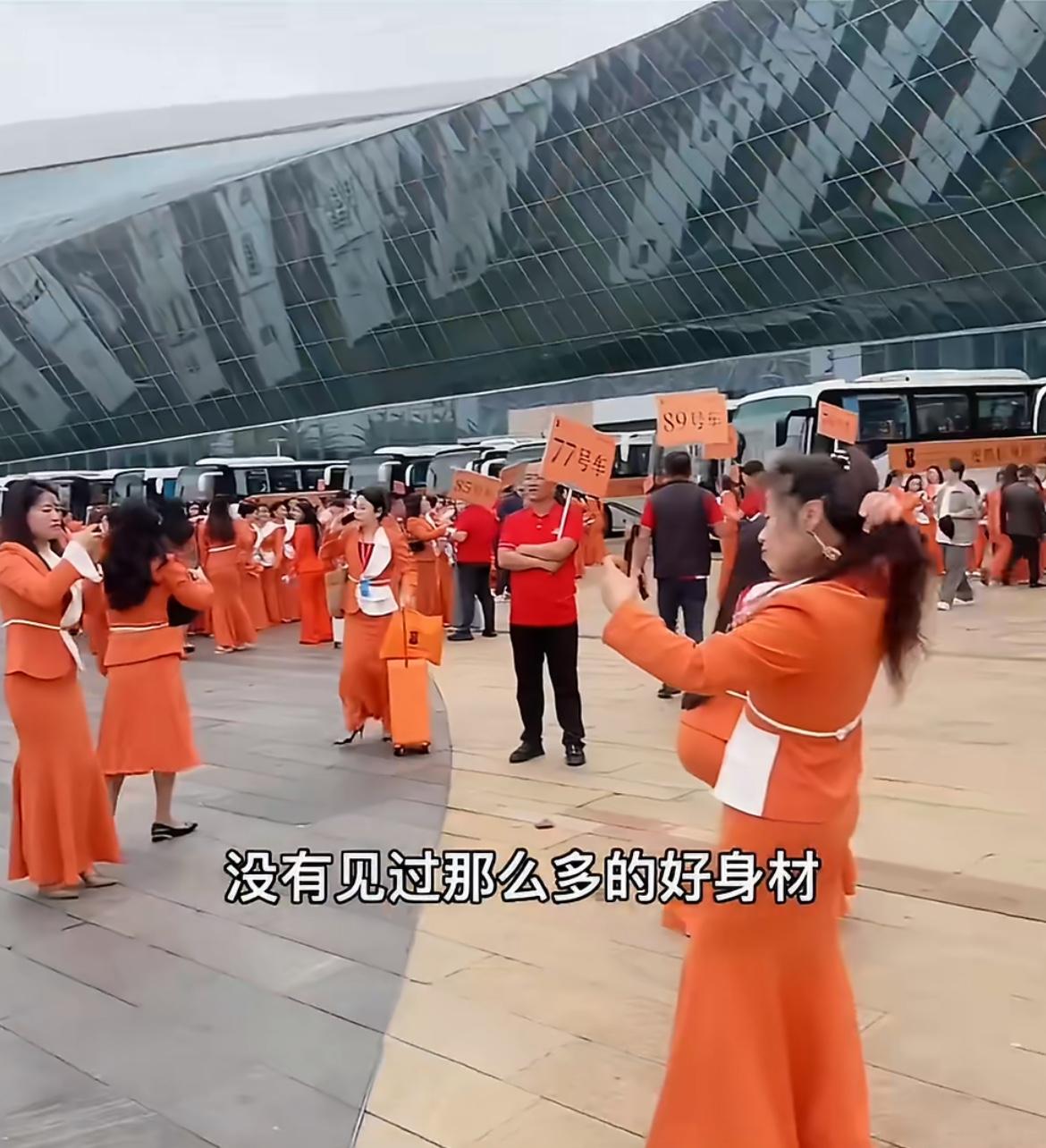 乌泱泱的一群统一着装的中年少女在搞事业,都是精致身材的职业装,橙黄色非常惹眼,据说有5000人之多,他们要去三亚旅游,这样的行为艺术是做给外人看的,给还没有入会的姐妹们看的,他们做的是塑身内衣,女人都需要。这种内衣估计不便宜,想必玩得是安利那一套。
