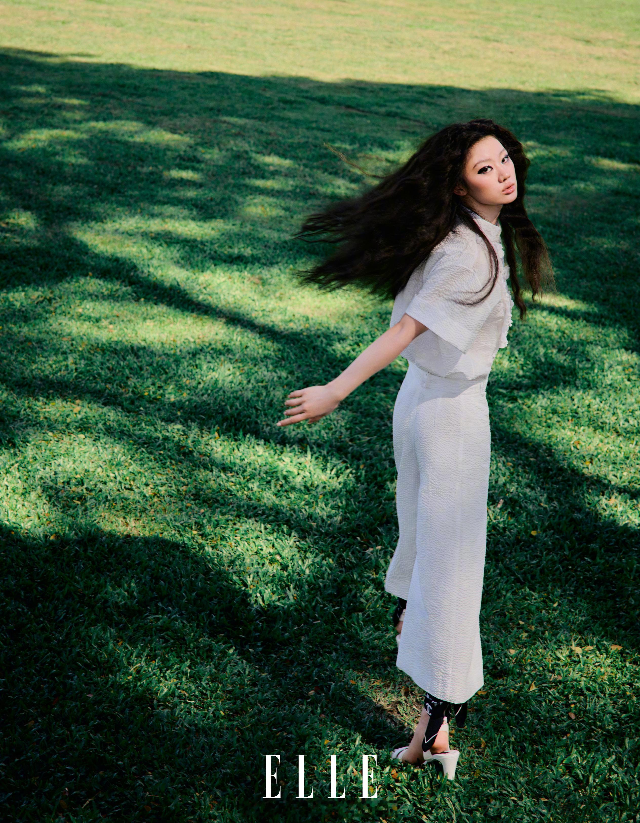 单依纯身着CHANEL26早春系列斜纹软呢套装,登上ELLE80周年增刊封面