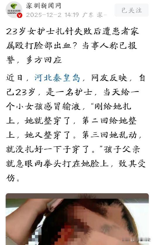 河北秦皇岛,23岁女护士小林给感冒发烧的小女孩输液扎针,第一次小女孩甩手针头穿血管,第二次挣扎又失败,第三次小女孩猛扭身体再次失败,女孩父亲王先生觉得小林不专业,拿女儿练手,情绪失控挥拳砸向小林,致其重症脑震荡、太阳穴骨裂、耳膜出血、下巴脱臼,小林报警求助。目前,小林在医院等手术。 据深圳新闻网报道,23岁护士小林,刚入职不久,对小患者向来耐心。 傍晚六点多,她饿着肚子还在给排队患儿输液。 这天来了个感冒发烧的小女孩,小林轻声哄着,可小女孩调皮哭闹还扭动身体。 小林刚参加工作不久,满心想着好好为患者服务。 她看着哭闹的小女孩,心里也跟着着急,但还是强忍着疲惫,轻声细语地安抚着。 可这小女孩根本不听,在家长怀里扭来扭去,就是不肯配合。 第一次扎针的时候,小林小心翼翼地找准血管,刚固定好针头,小女孩突然猛地一甩手,针头一下子穿过了血管,小女孩的手背瞬间肿了起来。 小林心里一阵愧疚,赶紧向家长道歉,然后准备重新扎针。 第二次扎针,小林更加仔细,重新找准了血管,还让家长帮忙按住孩子的胳膊。 可小女孩还是不停地挣扎,小林的手也跟着颤抖起来,结果又失败了。 这时候,小女孩的父亲王先生脸色已经变得很难看了,眼神里满是不满。 小林心里压力更大了,她深吸一口气,准备第三次扎针。 可这次小女孩扭动得更厉害了,小林的手根本稳不住,针又一次偏离了血管。 王先生看到女儿被扎了三次还没成功,顿时火冒三丈,觉得小林根本不专业,就是拿他女儿练手。 王先生情绪瞬间失控,他猛地站起来,挥起拳头就朝着小林砸了过去。 小林根本来不及躲避,被重重地打在了头上。 只听一声闷响,小林摔倒在地,眼前一阵发黑。 周围的家长和医护人员,都被这突如其来的一幕吓呆了,赶紧上前拉住王先生。 可此时的小林已经受了重伤,她感觉脑袋疼得要裂开,耳朵里嗡嗡作响,太阳穴也火辣辣地疼。 经检查,小林被诊断为重症脑震荡、太阳穴骨裂、耳膜出血、下巴脱臼。 她躺在医院的病床上,身体上的疼痛让她忍不住呻吟,心里更是委屈极了。 她只是想好好工作,怎么就遭遇了这样的事情呢? 小林的家人赶到医院,看到她这个样子,心疼得直掉眼泪。 他们果断报了警,希望警方能够查明真相,还小林一个公道。 王先生此时似乎也冷静了下来,但事情已经发生了,他必须为自己的冲动行为,付出代价。 王先生太冲动了,孩子扎针不成功是很常见的事情,不能把气都撒在护士身上。 王先生认为小林不专业,拿他女儿练手,所以情绪失控动手。 而小林则觉得自己只是正常工作,遭遇了无端的暴力。 从法律看,王先生的行为已经涉嫌故意伤害罪。 刑法规定,故意伤害他人身体的,处三年以下有期徒刑、拘役或者管制。致人重伤的,处三年以上十年以下有期徒刑。 小林被诊断为重症脑震荡、太阳穴骨裂、耳膜出血、下巴脱臼,这些伤情已经构成了重伤。 王先生挥拳砸向小林,导致她身体受到严重伤害,完全符合故意伤害罪的构成要件。他可能会面临三到十年的有期徒刑。 在医院这种公共场所殴打医护人员,是不是处罚会更重呢? 治安管理处罚法规定,扰乱公共秩序,妨害公共安全,侵犯人身权利、财产权利,妨害社会管理,具有社会危害性,依照刑法的规定构成犯罪的,依法追究刑事责任;尚不够刑事处罚的,由公安机关依照本法给予治安管理处罚。 在医院殴打医护人员,不仅侵犯了医护人员的人身权利,还扰乱了医院的正常秩序,属于情节较重的行为。 王先生除了可能面临故意伤害罪的刑事处罚外,还可能违反治安管理规定,面临十到十五日的拘留,以及五百到一千元的罚款。 民法典规定,侵害他人造成人身损害的,应当赔偿医疗费、护理费、交通费、营养费、住院伙食补助费等为治疗和康复支出的合理费用,以及因误工减少的收入。造成残疾的,还应当赔偿辅助器具费和残疾赔偿金;造成死亡的,还应当赔偿丧葬费和死亡赔偿金。 小林因为王先生的暴力行为受了重伤,她可以依据民法典的规定,向王先生主张医疗费、护理费、误工费等合理的赔偿费用。 如果小林因为这次受伤留下了后遗症,造成了残疾,还可以要求王先生赔偿残疾赔偿金。 而且,小林因为遭受暴力,精神上也受到了很大的伤害,她还可以主张精神损害抚慰金。 王先生故意伤害小林身体,致其重伤,其行为已构成故意伤害罪。 王先生在医院殴打护士,扰乱了医院的正常秩序,情节较重。 王先生将会为自己鲁莽的错误行为,付出应有的责任和惩罚。 遇到问题一定要冷静处理,暴力解决不了任何问题,只会让事情变得更糟。