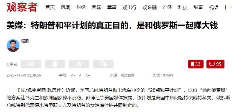 俄罗斯开出了特朗普无法拒绝的条件:2万亿美元的经济规模 12月2日,《华尔街日报》揭露了美俄之间的谈判细节,总结起来就是特朗普根本不在乎俄乌冲突打的怎么样,最在乎的就是如何从中赚钱。 今年10月份,俄罗斯总统特使德米特里耶夫访问美国,他与美特使惠特科夫和特朗普女婿库什纳进行了会面,德米特里耶夫直接提出一个方案,“美国可以利用俄罗斯在欧洲的3000亿美元在美俄之间进行投资,同时可以在美国的领导下重建乌克兰”。 这句看似简单的提议,实则藏着撬动2万亿美元经济规模的杠杆——俄方显然摸准了特朗普一切向钱看的脾气,把地缘政治博弈变成了生意场的价码牌。 这3000亿美元冻结资产只是开胃菜,德米特里耶夫心里清楚,真正的肥肉是俄罗斯的资源家底和战后重建的蛋糕,2024年俄罗斯名义GDP已达200万亿卢布,按当年汇率折算约合1.9万亿美元,而这一规模还是在西方制裁下实现的,背后是制造业4.6%的增速和机械制造业近20%的爆发式增长在托底。 更诱人的是未被挖掘的潜力,俄方主动抛出北极液化天然气项目、西伯利亚稀土开采权,甚至鄂霍茨克海的天然气资源,这些领域随便一个项目都能撑起数百亿美元的市场。 可以说,特朗普团队几乎是立刻嗅到了钱味,库什纳直接深度参与方案修订,最终拿出的“28点和平计划”里,乌克兰放弃顿巴斯、限制军队规模等条款处处透着对俄妥协的意味,说白了就是用乌克兰的利益换入场资格。 华盛顿的动作更直接:埃克森美孚高管偷偷会见俄石油总裁,想拿回当年退出“萨哈林1号”损失的资产;特朗普长子的好友忙着和诺瓦泰克谈北极项目股份,就等制裁解除的东风;连他的金主都盯上了破损的“北溪-2”管道,砸60万美元游说就为抢下收购权,这些人比谁都清楚,一旦美俄达成合作,2万亿美元的经济盘子里有的是分蛋糕的机会。 当然,俄方的筹码还不止于此,德米特里耶夫早就透露,“欧佩克+”的减产协议已给俄带来30万亿卢布额外收入,能源这块基本盘稳得很,而美国主导的乌克兰重建,本质上是让美国企业拿着俄方资产当启动资金,去赚重建的工程款——这种“用别人的钱办自己的事”的生意,特朗普最擅长。 惠特科夫直言不讳想让美俄乌成为“商业伙伴”,说白了就是要把战场变成商场,管它谁的领土谁的伤亡,有钱赚才是硬道理。 说到底,这2万亿美元的诱惑,本质是资源与权力的利益置换,俄罗斯用资源和市场换西方松绑,特朗普用地缘妥协换商界回报,唯独乌克兰成了待价而沽的筹码,普京说俄罗斯GDP已超德国成欧洲最大经济体,这话既是说给西方听的,也是说给特朗普听的——潜台词是“跟我合作,才能拿到真金白银”。 而特朗普团队模糊商业与政治的操作,早已把在乎赚钱写在了脸上:拒绝给乌克兰导弹,转头建议人家用关税豁免换经济刺激,活脱脱一副生意人的谈判腔调,但这种把战争当生意做的玩法,实在算不得体面,毕竟再庞大的经济规模,也填不满地缘政治的黑洞,更换不回真正的和平。