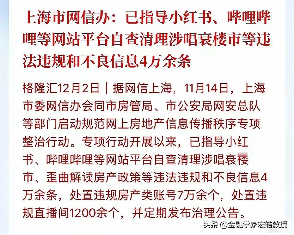 上海网信办出手了!重点清理唱衰楼市的违法违规信息!在小红书,哔哩哔哩等自媒体上唱衰上海楼市的房地产账号4万多个于近期被清理了,这些博主可能一夜之间账号就没了。 之前看到很多房地产中介账号的视频都夸张地说“业主出国五折大甩卖”这样的信息为了获客。 只要某小区的一套房子成交,那么这套房子的成交价就一定成了那个小区的最高价,中介为了促成交易会不断让业主降价,这样整个小区和周边小区的房价自然就都在短时间降下来了。 上海网信办及时出手也是为了稳定本地的一二手房的价格,毕竟上海已经是为数不多的已经实现房价回稳的城市,此次大量清理房地产中介自媒体违规账号与国家定调房地产“止跌企稳”的大政策背景是相符的。