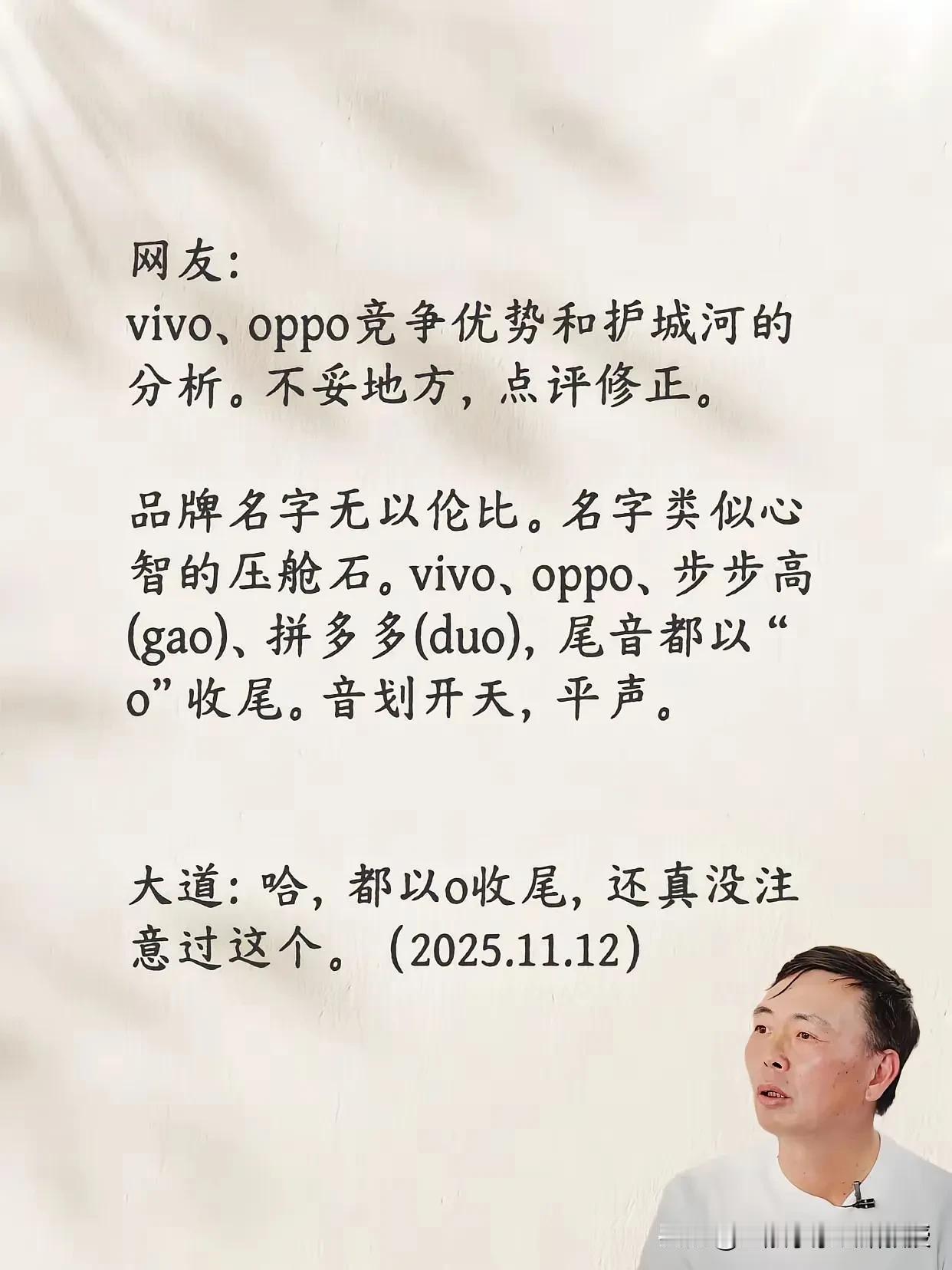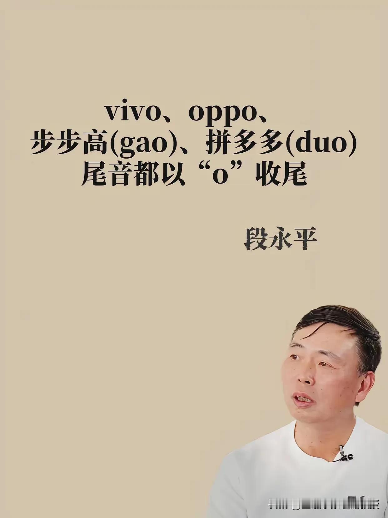 段永平的"O字玄学"!有网友说段永平创建的品牌名字都无与伦比。OPPO,VIVO,步步高(gao),拼多多(duo)都是以O结尾,包括段永平的笔名,大道(dao)也是如此,段永平说自己还真没注意到,仔细想想苹果(guo)也是O,不过英文是apple。 O在很多人眼里认为是圆满的寓意。OPPO,VIVO的出货量都能保持全球前五,段永平是这两个品牌的核心奠基者。 不管这些产品都是O结尾是不是巧合,但是段永平在制造业战略远见与品控坚守,拆分业务让品牌独立生长,坚守品控底线不盲目扩张,这些战略早已铸就穿越周期的商业传奇。