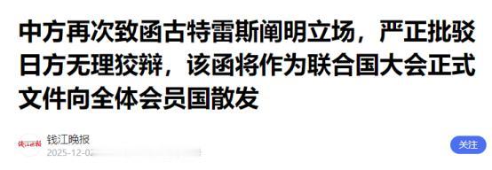 要说最近联合国里的一件大事,得从日本首相高市早苗的一句糊涂话说起。 11月7日那天,她在日本国会答辩时公然放话,说“台湾有事可能对日本构成存亡危机事态”,这话里话外的意思,明摆着是暗示日本可能会武力介入台湾问题。 别说是中国,连日本国内不少有识之士,包括前首相都站出来批评她,说这话太出格。这种颠倒黑白的做法,中方肯定不能忍。 12月1日,傅聪大使再次致函古特雷斯,这次直接把日方的狡辩一条条拆穿,把道理摆得明明白白。更重要的是,这封函件很快就会作为联合国大会正式文件,散发给所有会员国,相当于让全世界都看清日方的真实面目。 台湾是中国领土不可分割的一部分,这是铁打的事实,更是二战后国际秩序的重要组成部分。高市早苗这话,既违背了中日之间的政治承诺,也严重违反了《联合国宪章》的宗旨和原则。 中国常驻联合国代表傅聪第一时间就致函联合国秘书长古特雷斯,把中方的严正关切说清楚了。按说日方该好好反思认错,可他们倒好,反过来倒打一耙。 11月24日,日本常驻联合国代表山崎和之也给古特雷斯写了封信,通篇都是无理狡辩,回避关键问题还无端指责中方。 日方一直嘴硬说自己坚持“一贯立场”,可中方追问了好几次,他们始终躲躲闪闪,说不出这个“一贯立场”到底是什么。要知道,《开罗宣言》《波茨坦公告》这些国际法文件早就明确了,台湾是中国领土,日本必须归还。 1972年的《中日联合声明》里,日方也清清楚楚承诺过,承认中华人民共和国政府是中国唯一合法政府,充分理解和尊重台湾是中国一部分的立场。现在高市早苗说这种话,根本就是背弃承诺,怎么可能取信于国际社会? 傅聪大使在信里把话说得特别明白,首先就点出问题的根源——高市早苗的言论本身就是挑衅,根本不是日方说的“基于专守防卫”。 台湾是中国的地方,日本却把“台湾有事”和自己的“存亡危机”绑在一起,这早就超出了所谓“被动防御”的范畴,纯属自相矛盾,根本是在骗国际社会。 联合国把中方的函件作为正式文件散发,本身就说明在这件事上的立场——中方的主张站得住脚,符合国际法和国际秩序,而日方的挑衅言行根本站不住脚。 毕竟联合国从始至终都坚持一个中国原则,联大第2758号决议早就从政治、法律和程序上解决了台湾在联合国的代表权问题,明确台湾是中国的一部分,这是不容挑战的。 更讽刺的是,日方在信里还影射指责中国发展国防力量,这简直是贼喊捉贼。这些年日本的防卫预算已经“十三连增”,早就突破了战后“专守防卫”的框架。 修改“武器出口三原则”往外卖杀伤性武器,还在打“无核三原则”的主意,明摆着是在重新武装。历史上日本就常以“存亡危机”为借口扩军备战、发动侵略,现在又来这套,国际社会能不警惕吗? 高市早苗当初说那些话的时候,恐怕没料到会引来这么大的反弹,更没料到中方会用这么有力的方式回应,还得到了联合国的认可。 这事儿也给所有国家提了个醒,台湾问题不是可以随便碰瓷的,违背国际法、挑战战后秩序,最终只会搬起石头砸自己的脚。现在就看日方接下来怎么选了,是赶紧纠正错误,还是一条道走到黑,后果只能自己承担。 现在日本网民里也有不少人看不过去,说高市早苗的言论把日本拖进了危险的境地。国际社会更清楚,台湾问题是中国内政,任何外部势力插手都是违反国际法的。 日方要是真的想和中国好好相处,就该赶紧收回这些错误言论,老老实实地遵守一个中国原则,而不是在联合国耍小聪明狡辩。