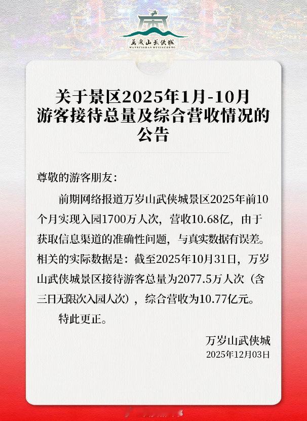 万岁山前10个月入园人次总量超2000万万岁山武侠城景区营收公告12月3日,万岁山武侠城景区发布《关于景区2025年1月-10月游客接待总量及综公营收情况的公告》,公告称:前期网络报道万岁山武侠城景区2025年前10个月实现入园1700万人次,营收10.68亿,由于获取信息渠道的准确性问题,与真实数据有误差。相关的实际数据是:截至2025年10月31日,万岁山武侠城景区接待游客总量为2077.5万人次(含三日无限次入园人次),综合营收为10.77亿元。