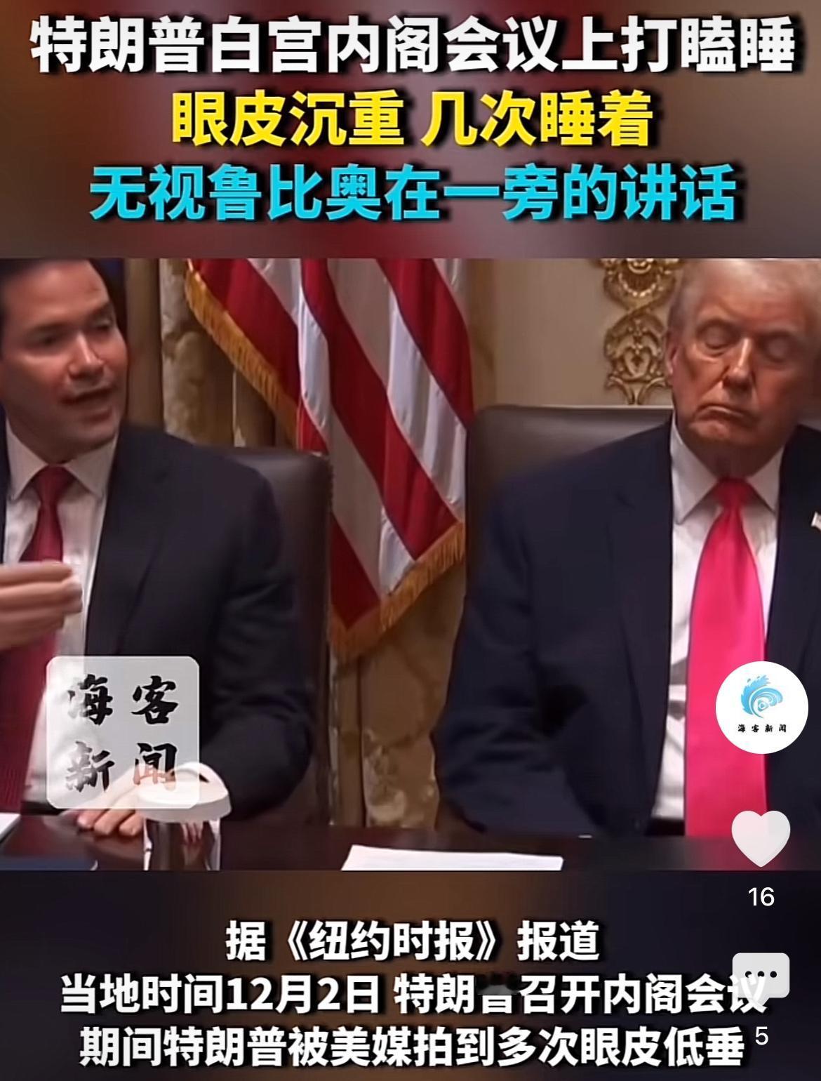 近日,白宫内阁会议上,部长们正侃侃而谈,记者捕捉到特朗普竟昏昏欲睡😪,对一旁滔滔不绝的国务卿卢比奥视而不见。 特朗普向来标榜自己精力充沛,还极度鄙视老态尽显的拜登,常称其为“瞌睡乔”。可如今,他也变成了自己曾最厌恶的模样! 不过,他已年届八十,刚花6个小时发了160条帖文,在参加一场长达4个小时的冗长会议,如此状态倒也情有可原,都不容易!