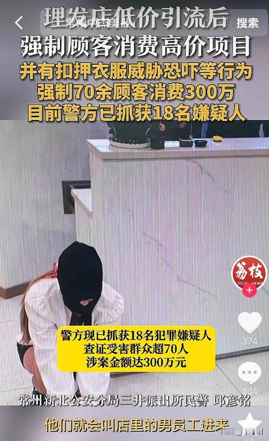 只要胆子大,理发店也可变缅某地啊,这不常州就开了一家,不折不扣的“恐吓”店,变相打劫300万,受害人达70人。 今年10月以来,常州派出所连续接到群众的报警电话,举报了一家名为“中杰美业”的理发店,对于消费者以低价引流上门,再以高消费项目对顾客进行强买强卖。 总之你只要进店就得脱一层皮,是真脱了,原来这家店对外宣传30块钱就可以做4次洗剪吹的项目,吸引了很多顾客。进店的顾客,光是消费洗洗头,理理发可不行,人家二楼还有拔罐服务呢,就这拔罐服务坑坏了一众人啊。 店家介绍拔罐只需要50块钱还送一条内裤,这个价格吸引了很多来洗剪吹的人,上去一顿美女服务,外加猛虎操作上罐啊,一个背敢跟你拔一百个罐,等顾客结账才告诉你,一个罐50。。。。。 这还没完,店家都不会给你穿衣服的机会,怪不得送小内裤呢,原来顾客的衣服全部店家收走了,有专门偷看顾客密码的服务员,要么直接拿着手机强制结账,要么就是叫来安保“协助”你结账,实在没钱的,当场给你办理贷款。 终于在第70个受害者的反抗下,这家理发店近日被警方一锅端了,抓获18人啊,据周围商家说,经常看到有顾客从理发店哭着跑出来,太心酸了。 (图片来自网络视频)