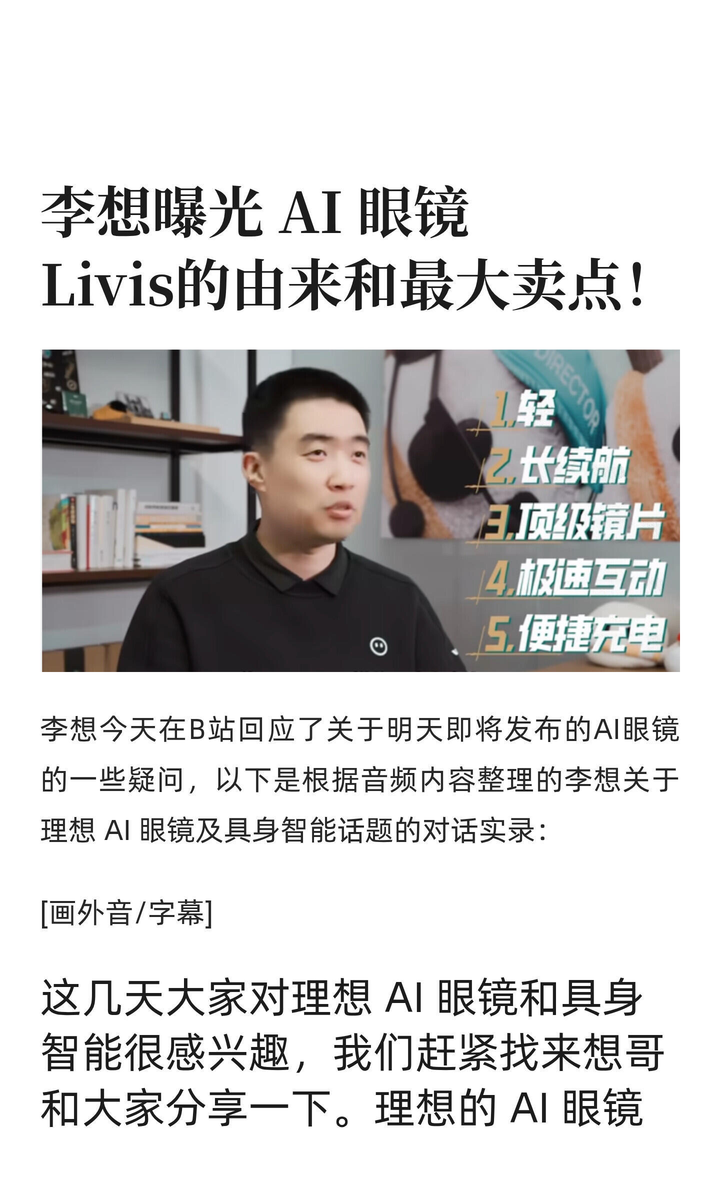 今晚7点半蹲个发布会,希望带光波导,能显示文字。你说会不会有人先买理想智能眼镜,用的好再买理想汽车?理想AI眼镜Livis理想蔡司战略合作