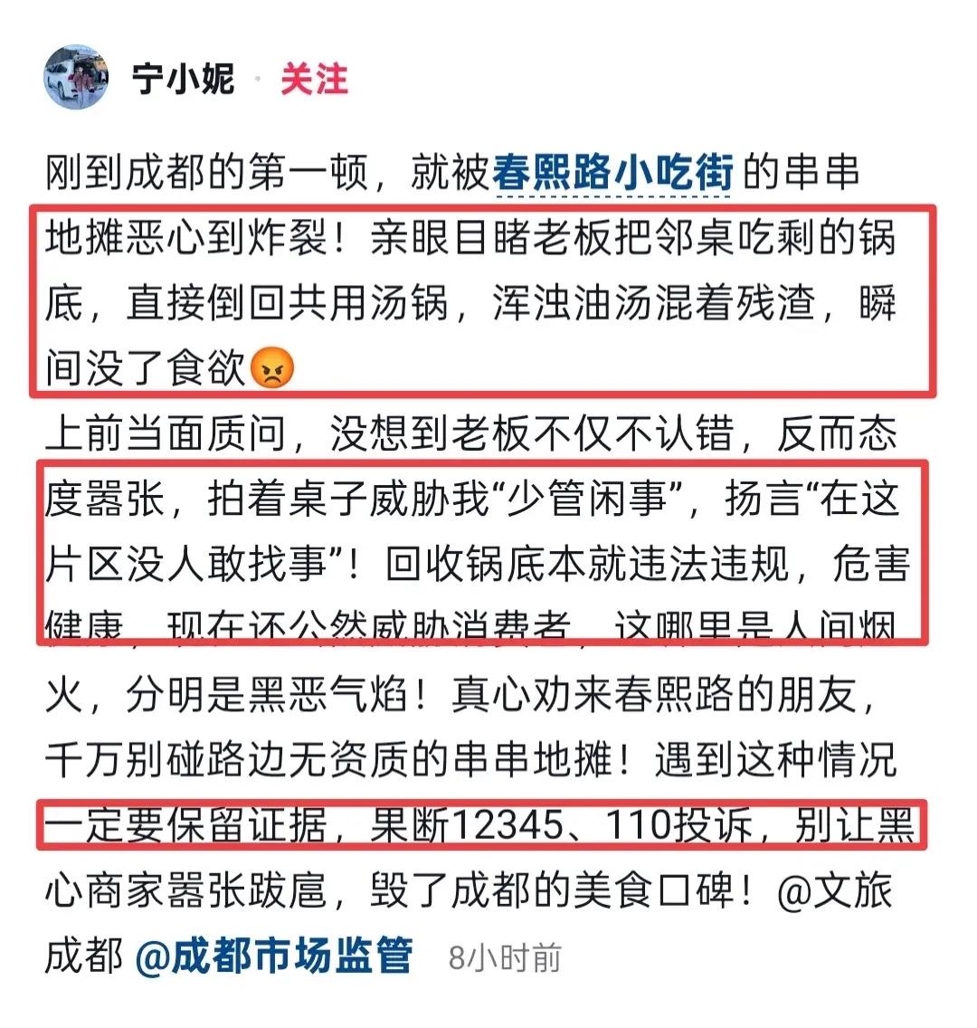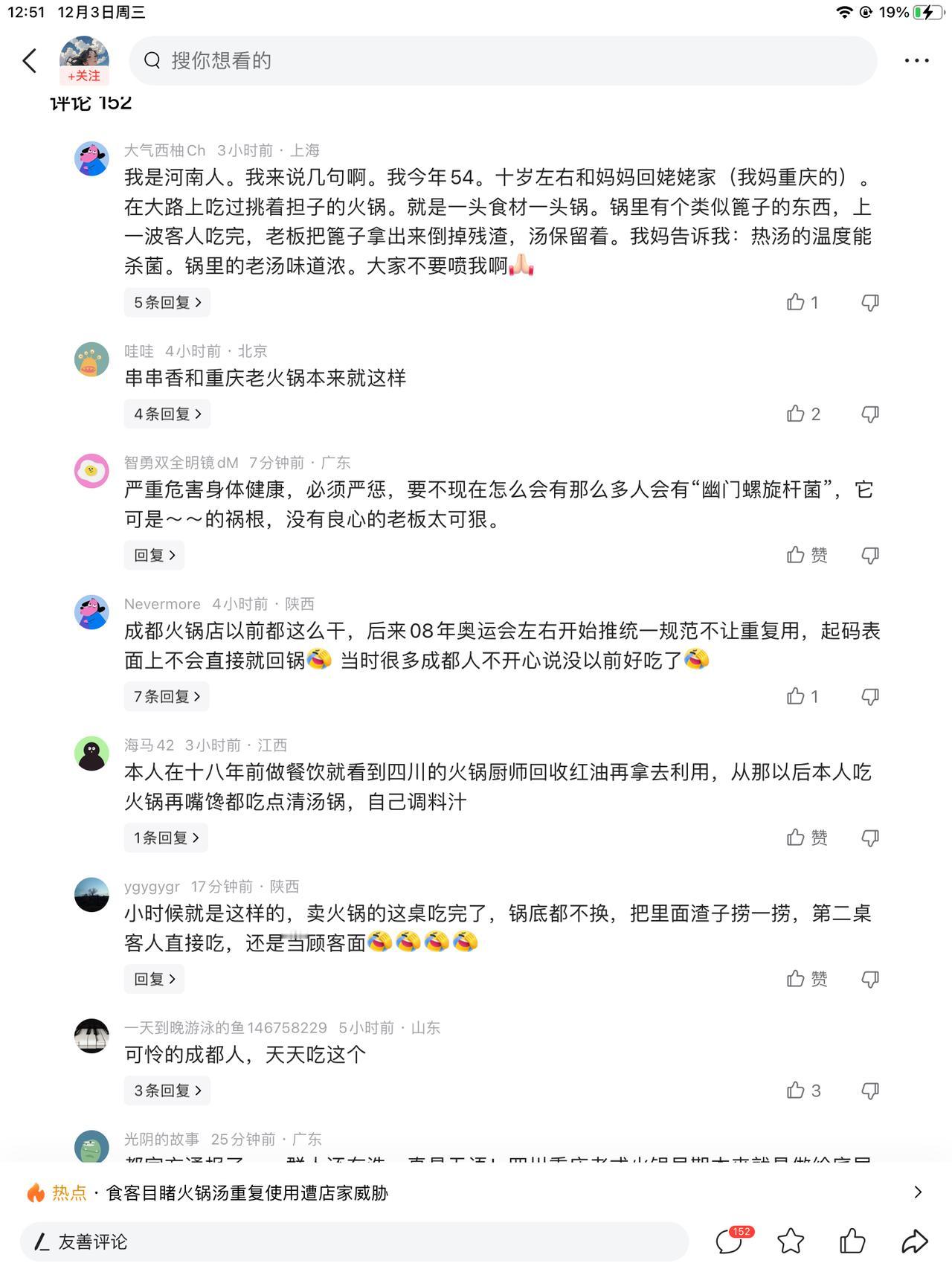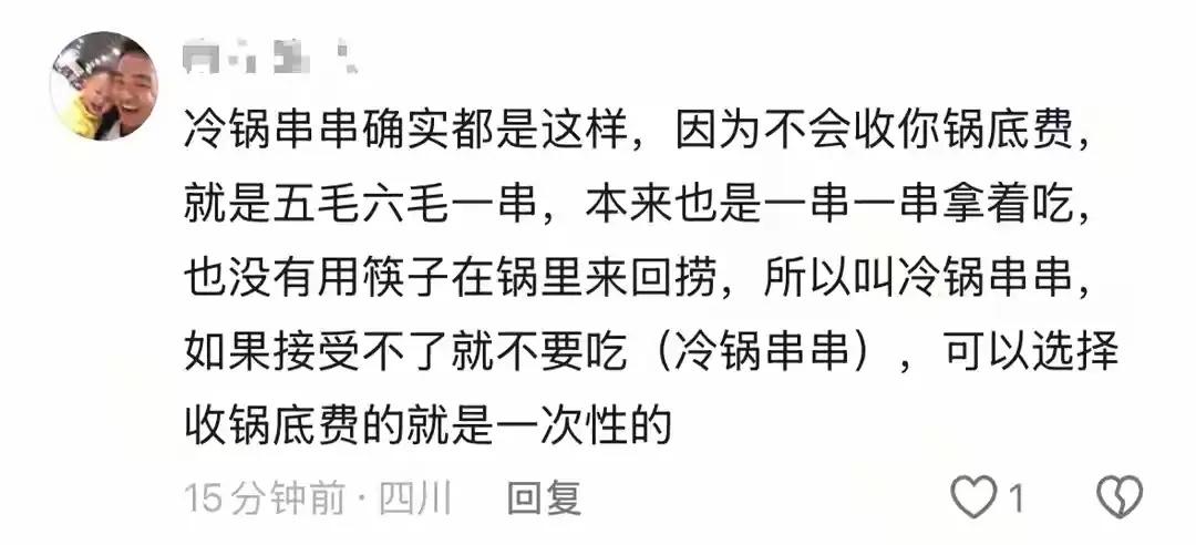 重庆冷锅串串这个事,我没有发言权。贱嗖嗖的也来说两句。我没吃过,口水锅底。听说是很普遍的现象,除非单独收你锅底费用。 我是不会吃的。我嫌弃,那么多人吃过的东西,倒回去,再吃。想想还是接受不了。 本地人吃,我只有一个疑问,没有病毒吗?不怕传染吗?不怕就好。这是习惯,是习俗,是公众认可的。我不讽刺人家。这有点正常。 我们本地,一到夏天,海边跟煮饺子似的。你说没有病毒吗?海边还好。接受不了的是一些水上游乐项目,有一年,带孩子去,那水里都是灰卷卷,来都来了是吧!下水了。回去孩子身上起了一层红疙瘩,看了很久才下去。你很难想象,如果有病,如果咱身上有伤口。跟大澡堂子一样。过去能洗大塘子,现在,不能了。重庆美食 人教人学不会,事儿教人一次就够。再也不敢去了。 冷串店家直接回收直接利用,都没有再加热一下。哎呀,说真的,你们吃吧!我没饿急眼之前,吃不了一点。 除非…荒野求生。老鼠都上桌了,还能说啥。重庆 重庆很好,现在依然很好。介意不吃就行了。